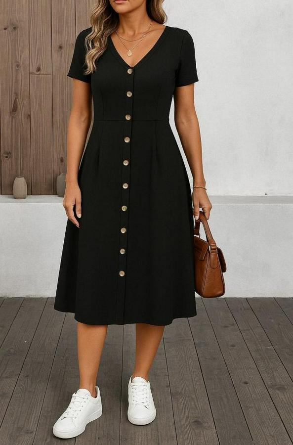 Kısa Kollu V Yakalı Önden Düğmeli A Kesim Dokuma Elbise
