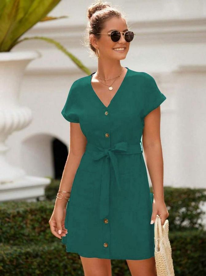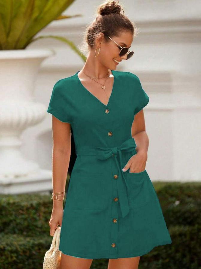 Kadın Kısa Kollu V Yakalı önden Düğmeli Belden Kuşaklı Cepli Sofya Elbise