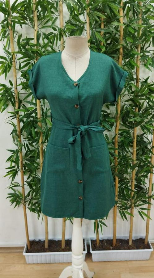 Kısa Kollu V Yakalı Önden Düğmeli Belden Kuşaklı Cepli Sofya Elbise