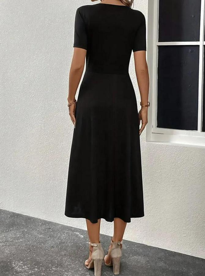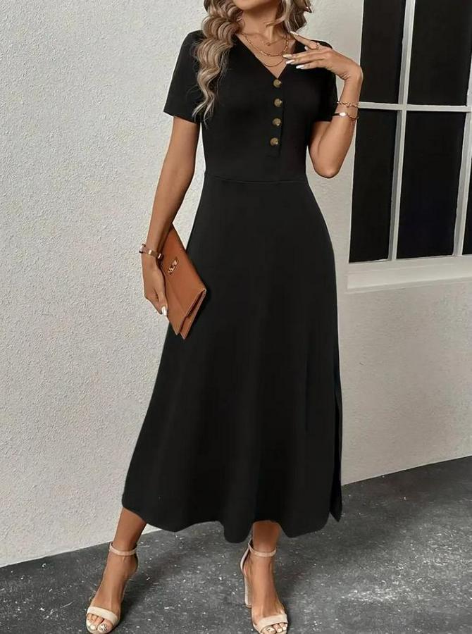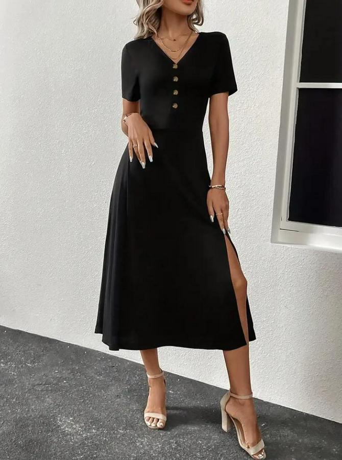 Kısa Kollu V Yakalı Önden Düğmeli Yırtmaçlı Midi Viskon Elbise