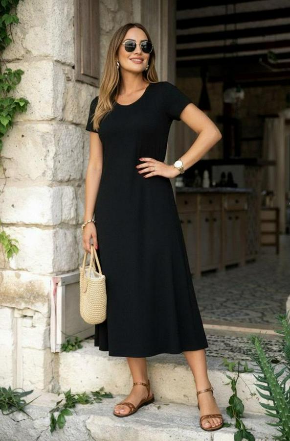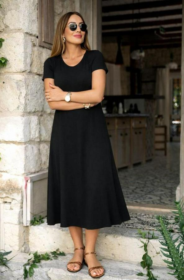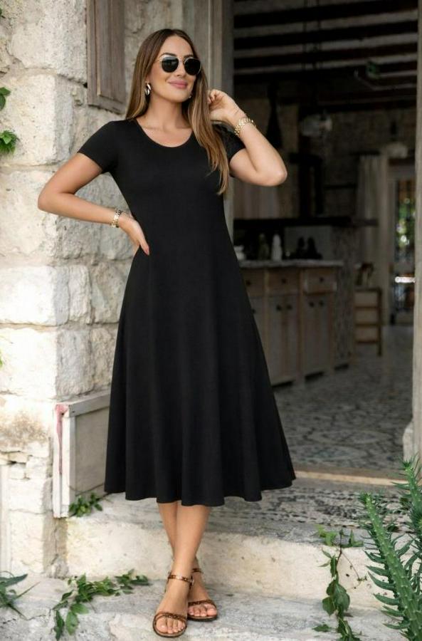 Kısa Kollu V Yakalı Yırtmaçlı Midi Viskon Elbise