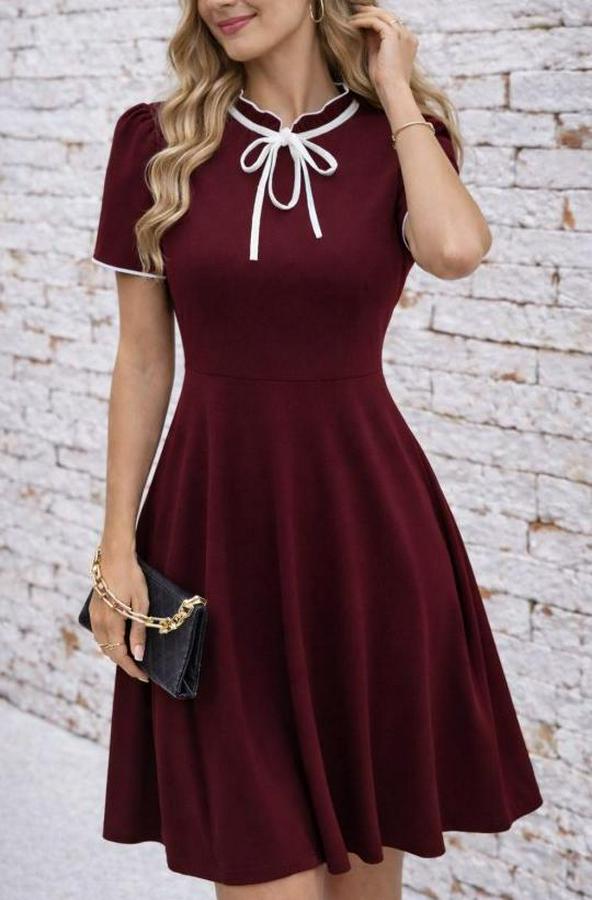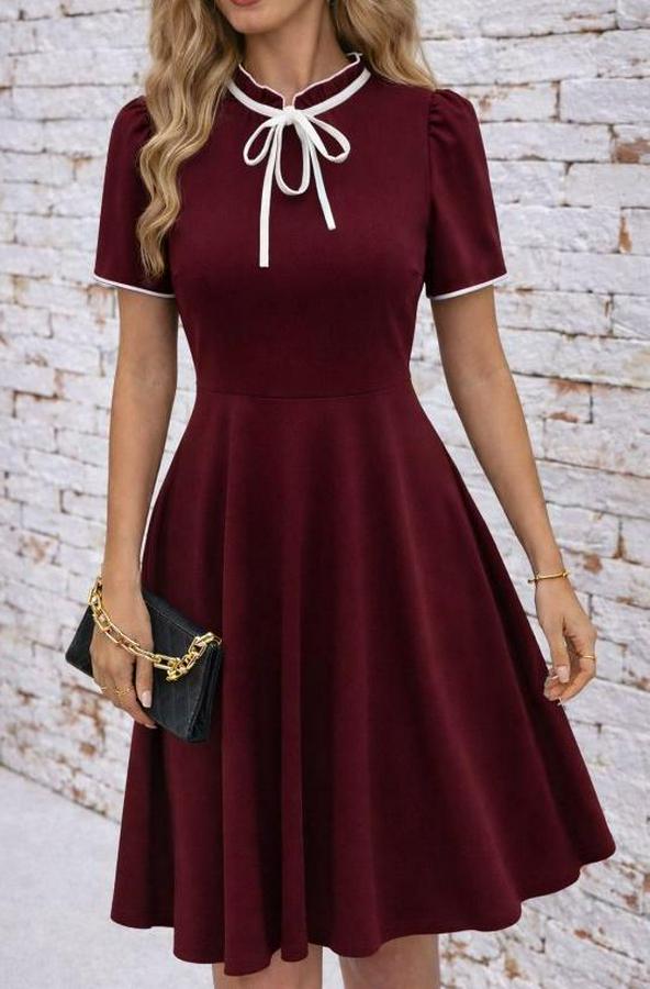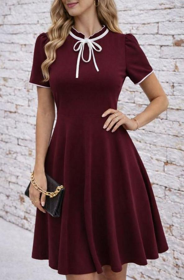 AnasayfaTüm ÜrünlerElbiseKısa Kollu Yakadan Bağcıklı Ve Fırfırlı Midi Janjan Krep Elbise