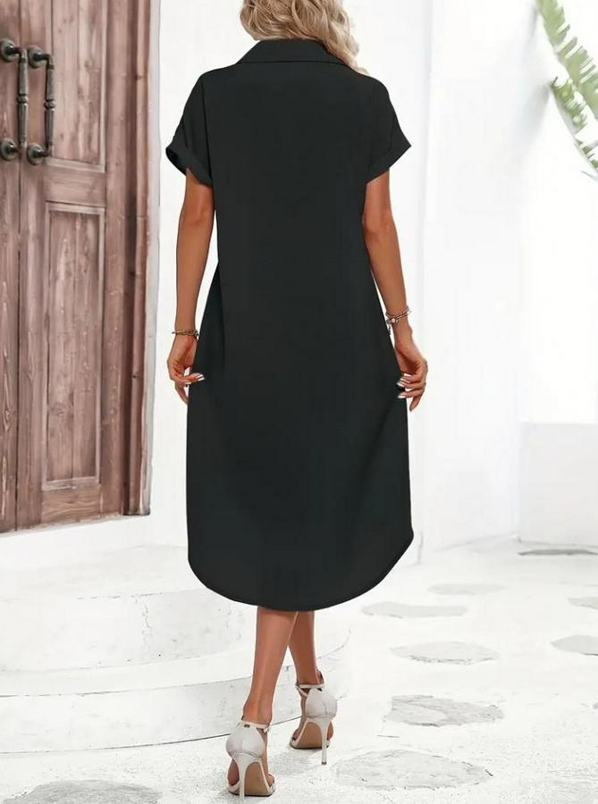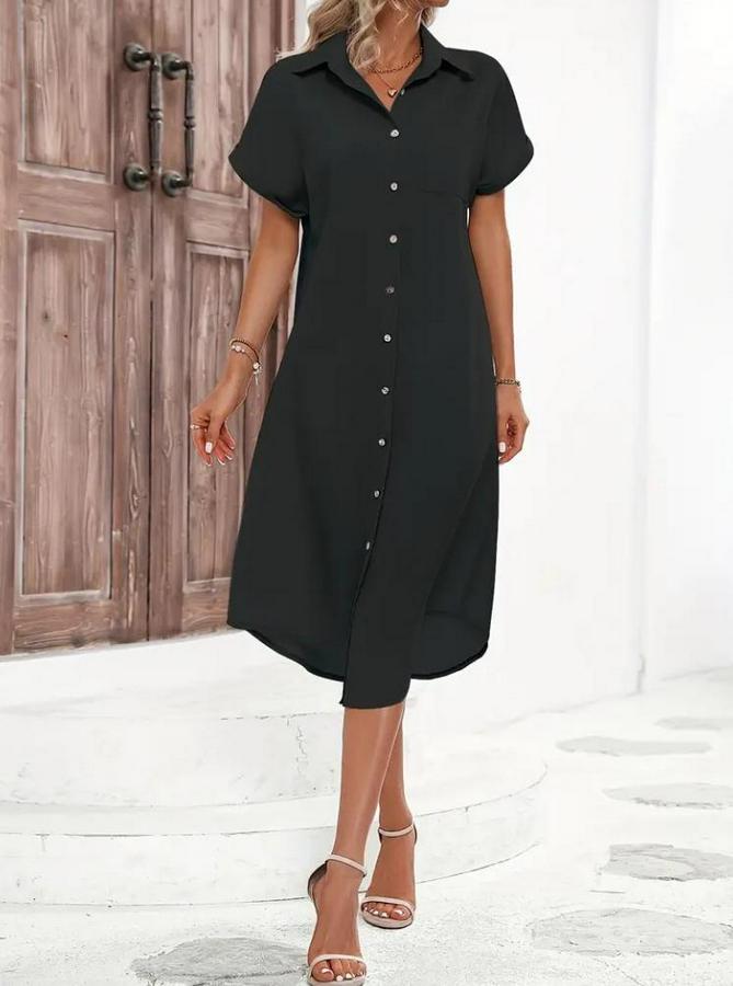 AnasayfaTüm ÜrünlerElbiseKısa Kollu Yakalı Düğme Detay Midi Dokuma Elbise