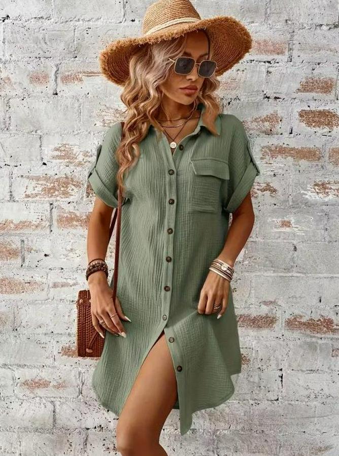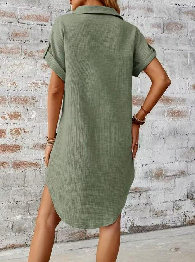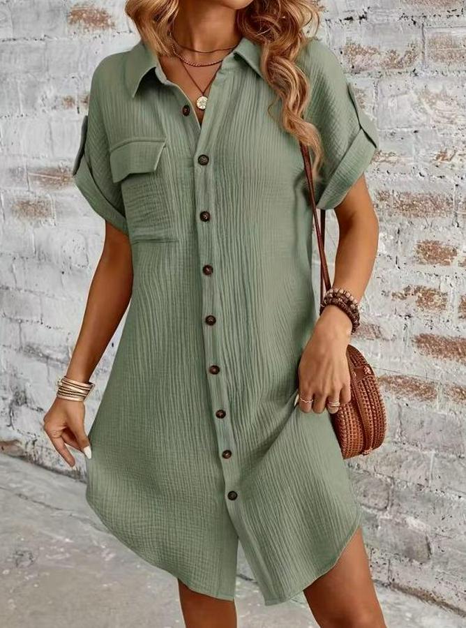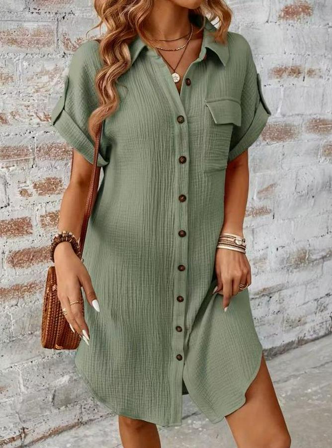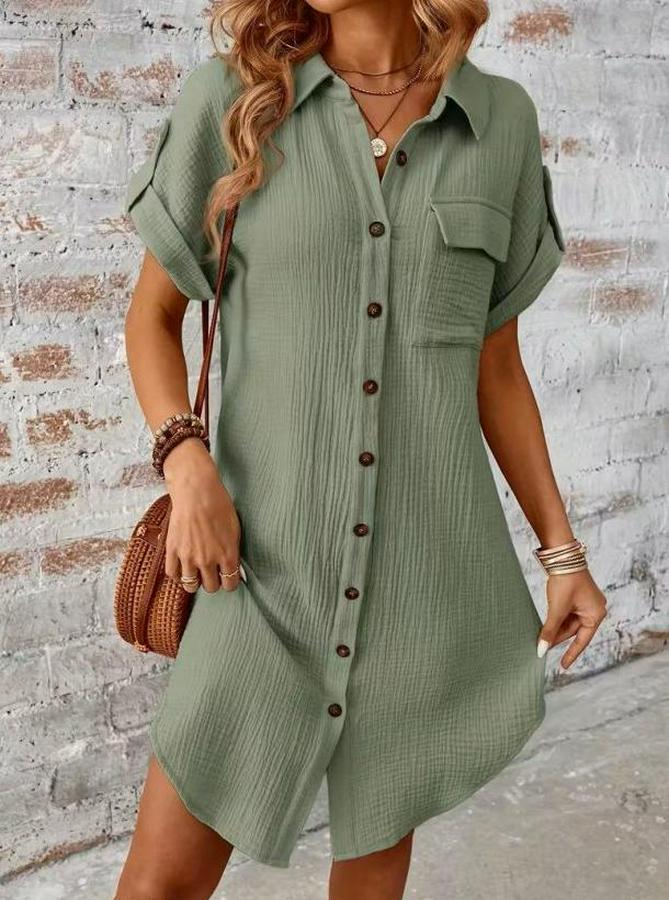 Kısa Kollu Yakalı Önden Düğmeli Bürümcük Kısa Elbise