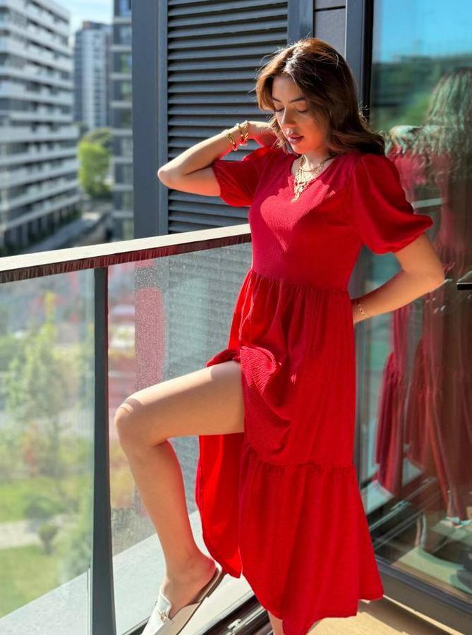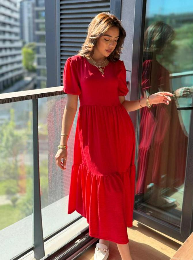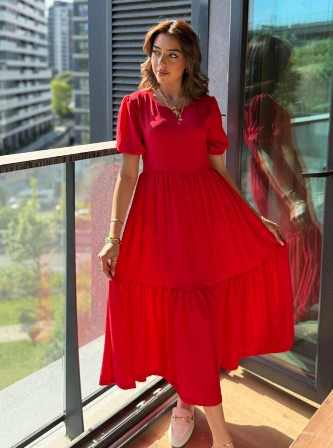 Kısa Kollu Yakası Açık Katlı Bürümcük Balon Elbise