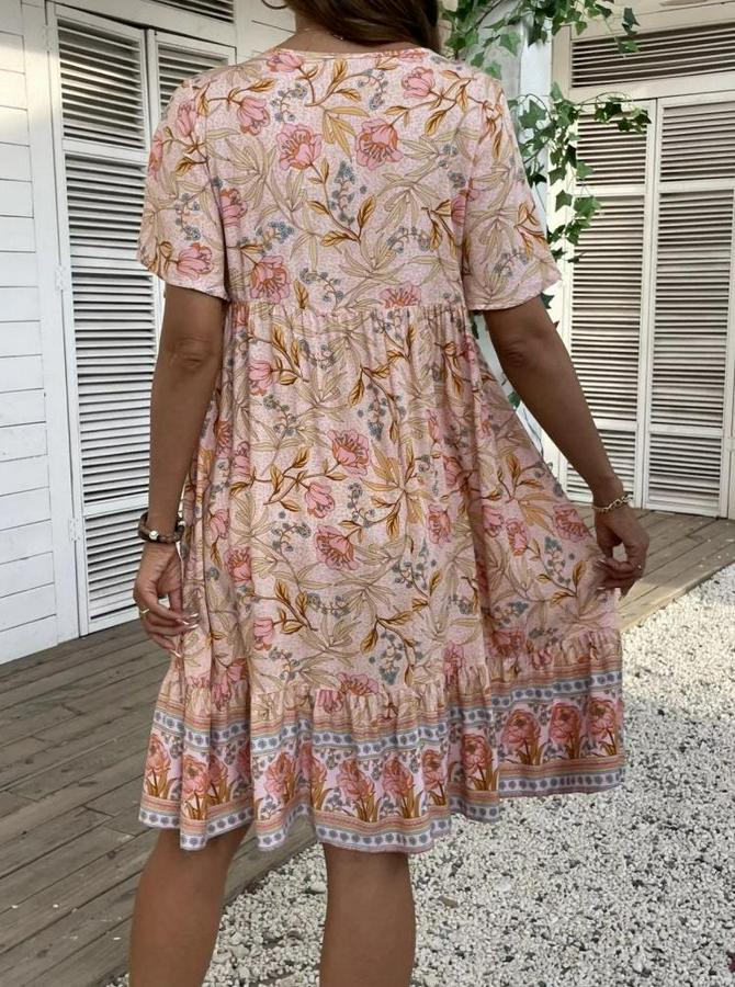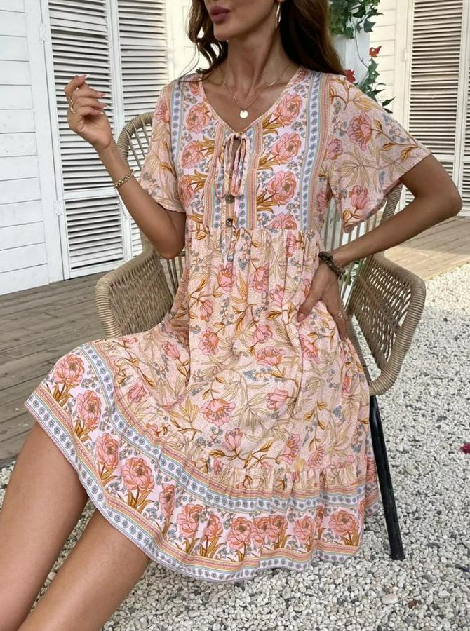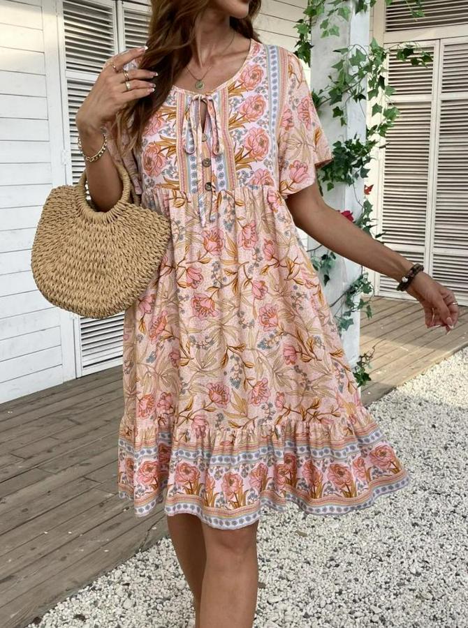 Kadın Kısa Kollu Yakası Bağcıklı önden Düğmeli Fırfır Desenli Süprem Elbise