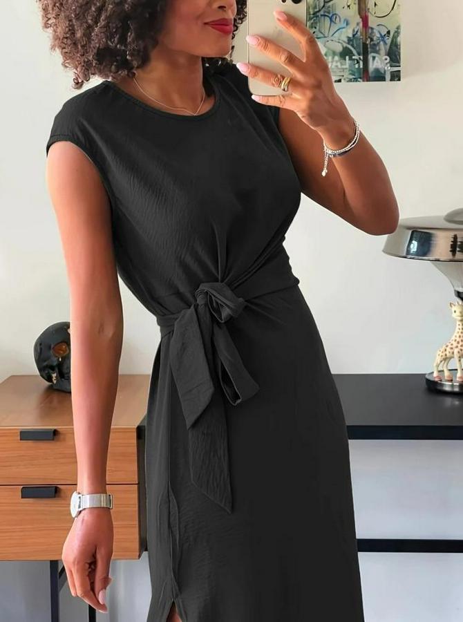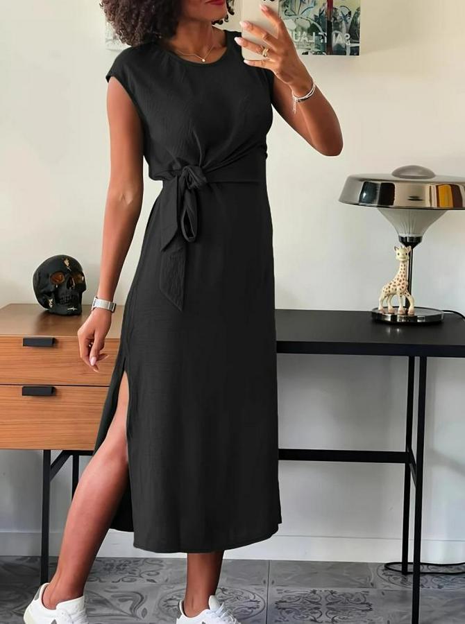 Kadın Kısa Kollu Yuvarlak Yaka Belden Bağcıklı önden Yırtmaçlı Aerobin Elbise