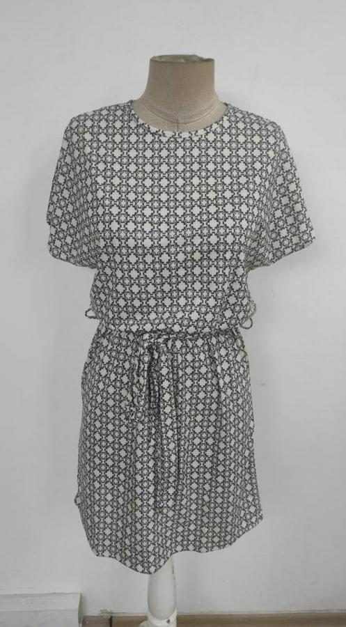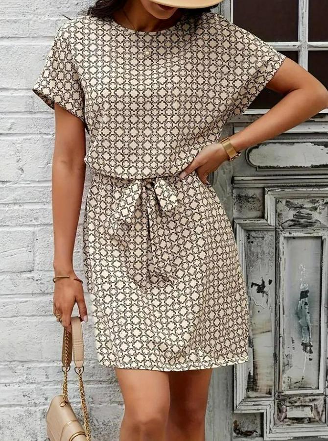 Kısa Kollu Yuvarlak Yaka Beli Kuşaklı Geometrik Desenli Süprem Elbise