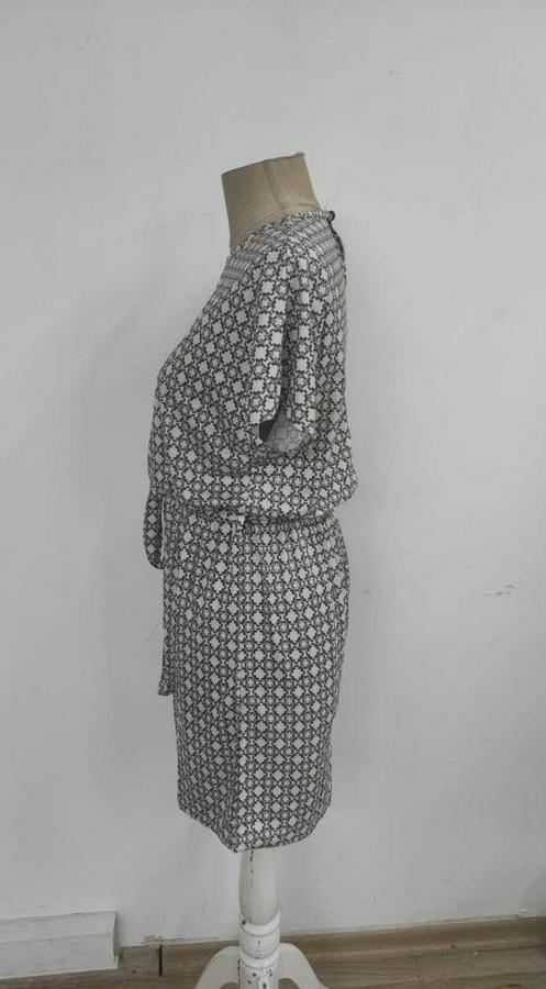 Kadın Kısa Kollu Yuvarlak Yaka Beli Kuşaklı Geometrik Desenli Süprem Elbise