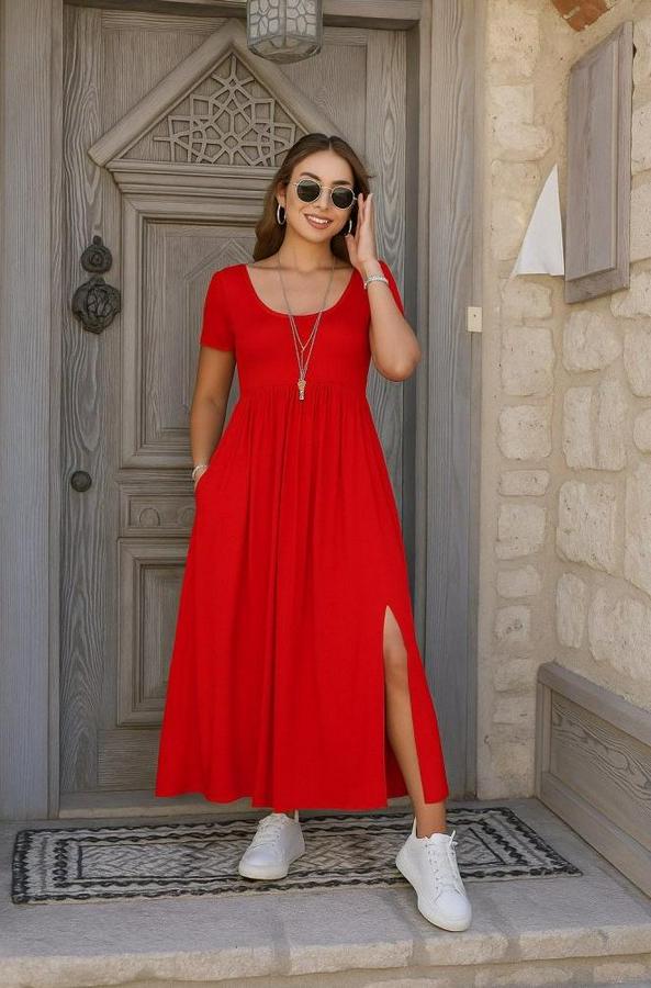 Kadın Kısa Kollu Yuvarlak Yaka önden Yırtmaçlı Cepli Viskon Uzun Elbise