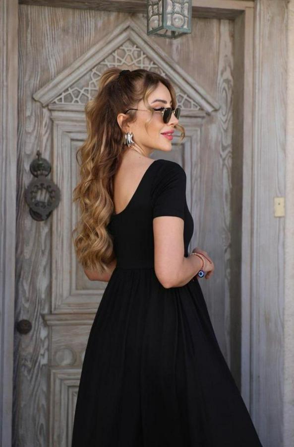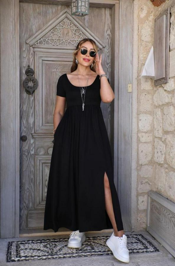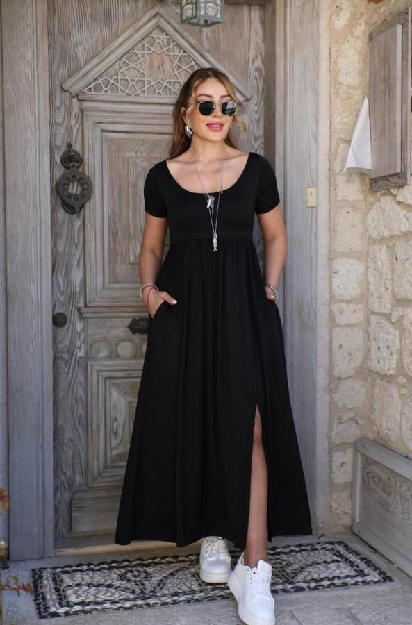 AnasayfaTüm ÜrünlerElbiseKısa Kollu Yuvarlak Yaka Önden Yırtmaçlı Cepli Viskon Uzun Elbise
