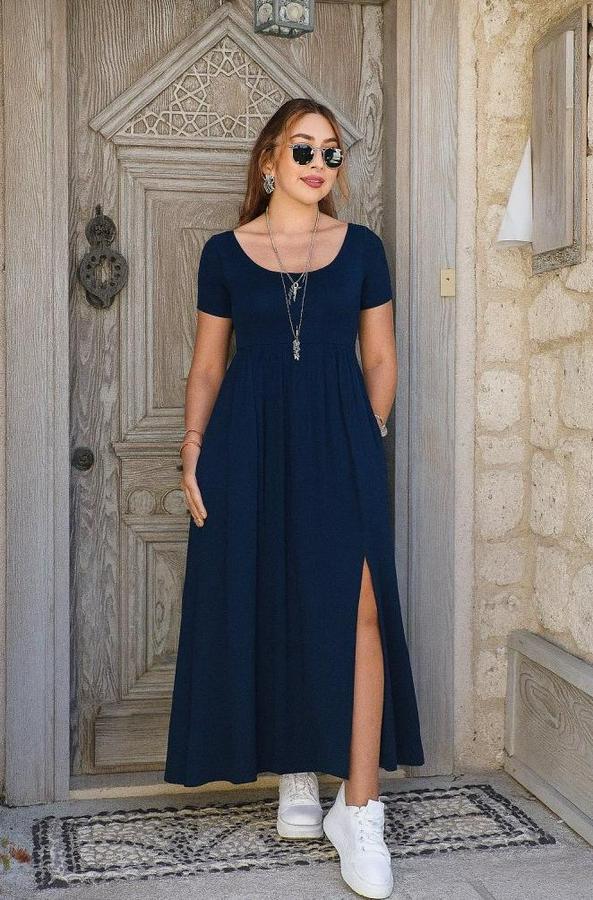 Kadın Kısa Kollu Yuvarlak Yaka önden Yırtmaçlı Cepli Viskon Uzun Elbise