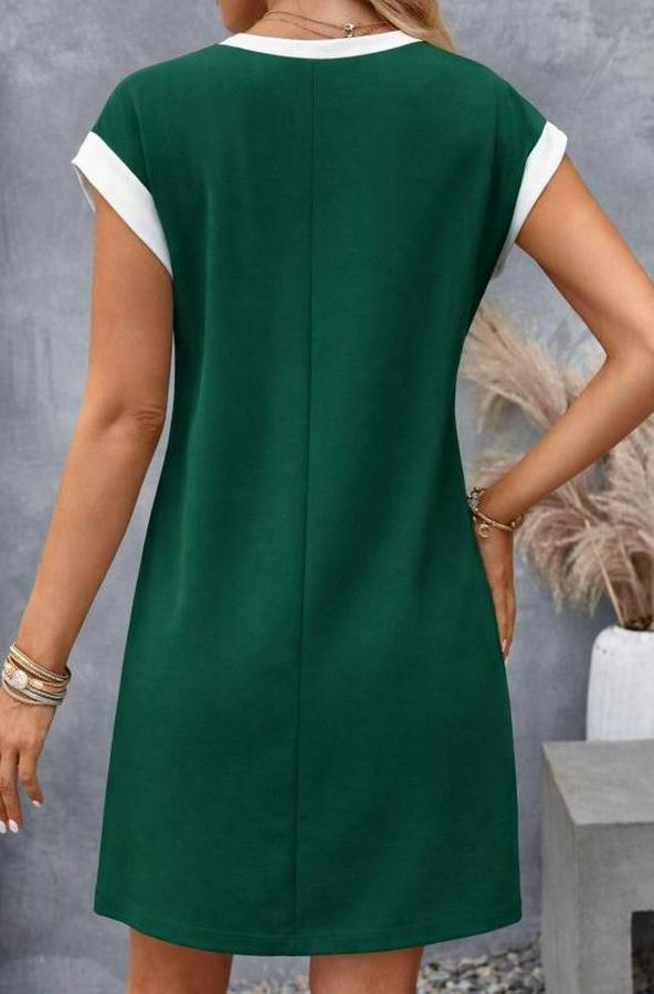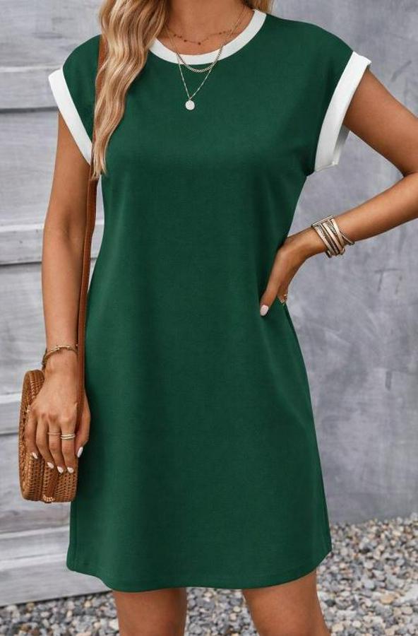 Kadın Kısa Kollu Yuvarlak Yakalı Kontrast Manset Detaylı Kısa Janjan Krep Elbise