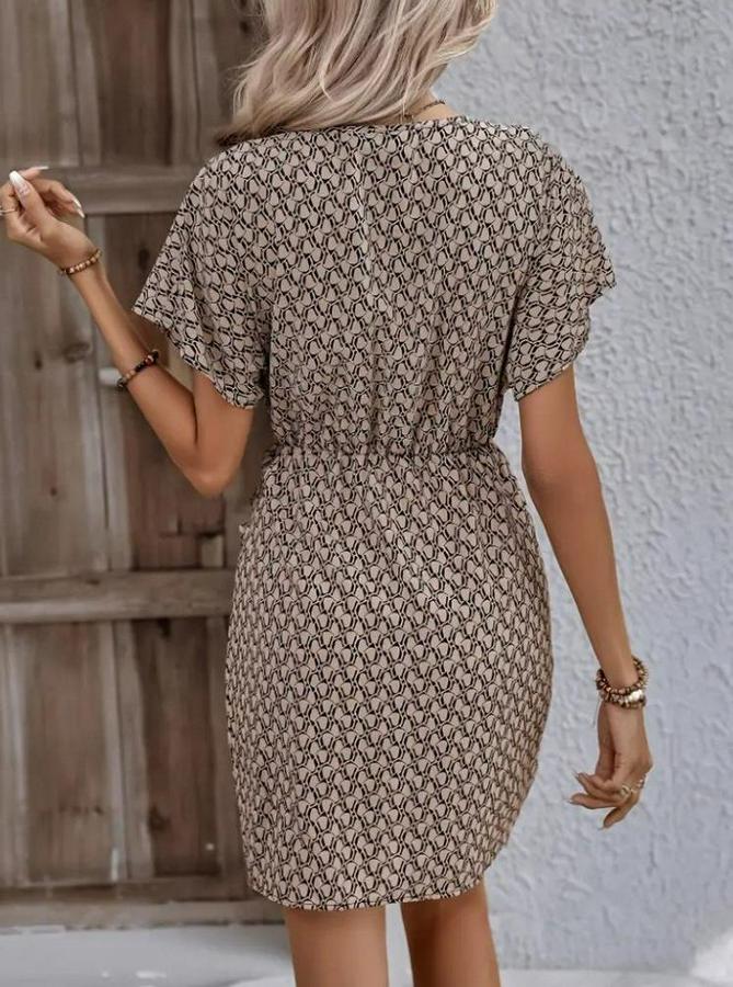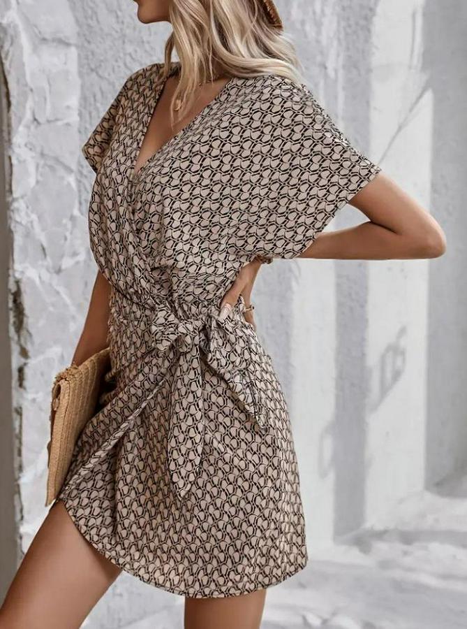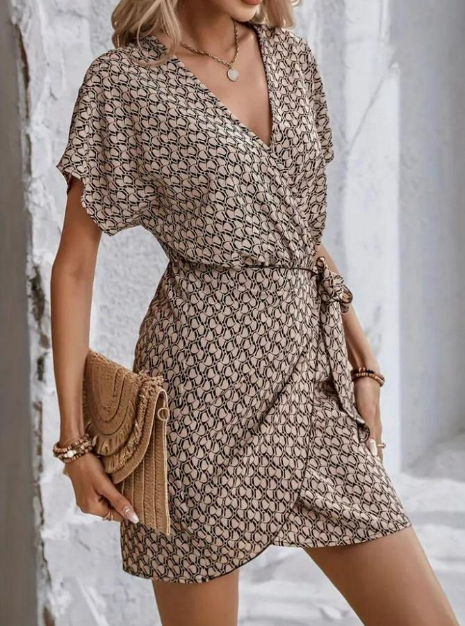 Kadın Kısa Yarasa Kollu önden Kruvaze Yaka Detaylı önden Bağlamalı Desenli Süprem Elbise