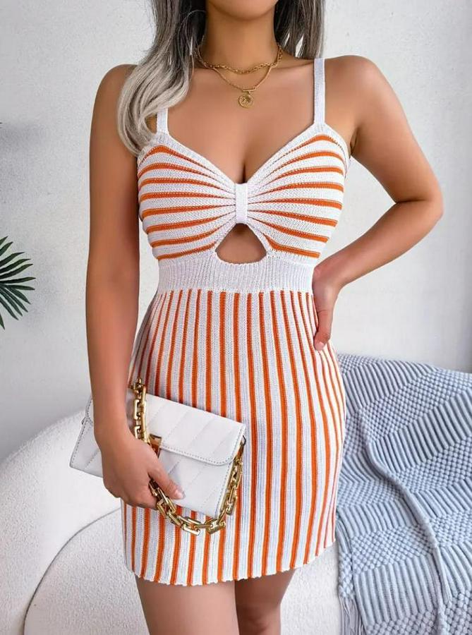 Kolsuz Askılı Pencere Detay Şerit Desen Mini Triko Elbise
