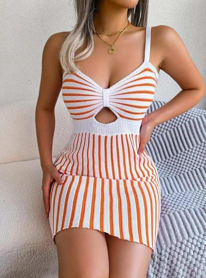 Kadın Kolsuz Askılı Pencere Detay şerit Desen Mini Triko Elbise
