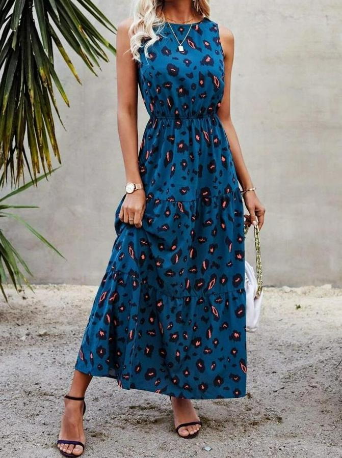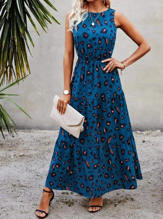AnasayfaTüm ÜrünlerElbiseKolsuz Bisiklet Yaka Beli Lastikli Desenli Süprem Elbise