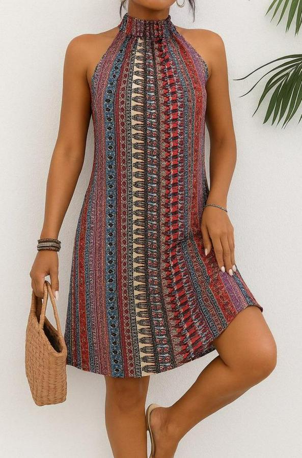Kadın Kolsuz Boyundan Askılı Desenli Midi Süprem Elbise