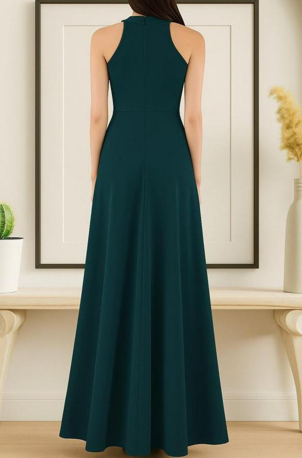 AnasayfaTüm ÜrünlerElbiseKolsuz Halter Yaka Derin Yırtmaç Detaylı Tam Boy Ithal Krep Elbise