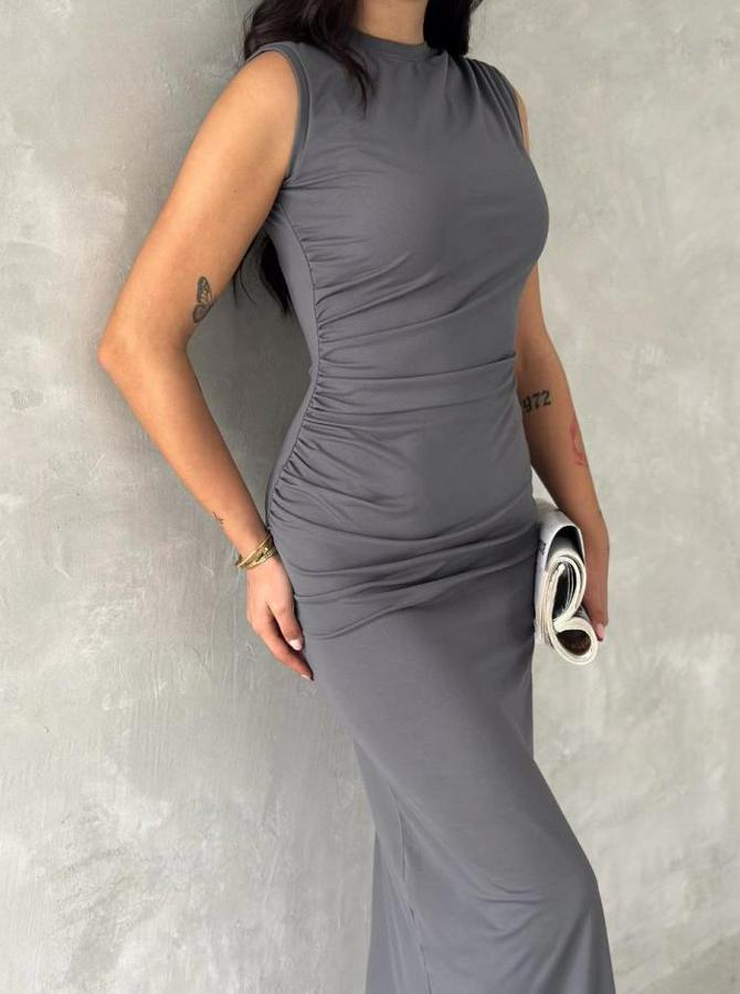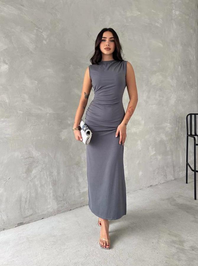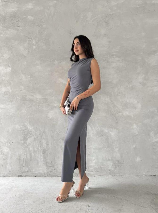 Kolsuz Yırtmaçlı Uzun Maxı Boy Elbise - Gri