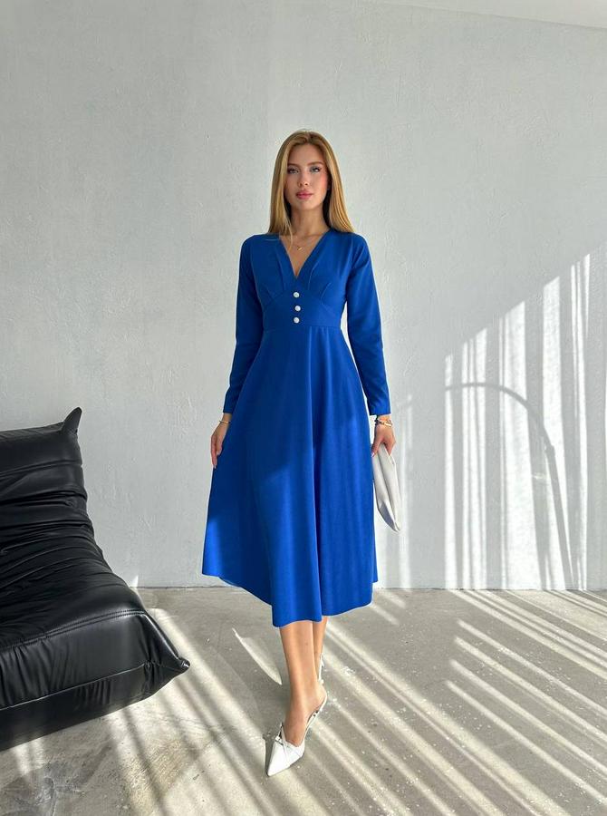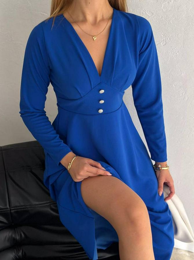 Krep Kumaş Düğme Detaylı V Yaka Uzun Kollu Midi Boy Elbise