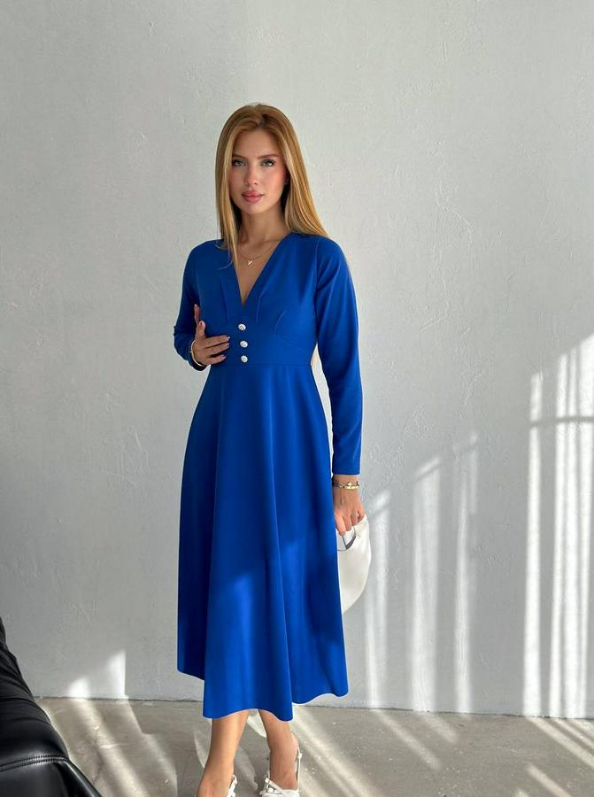 AnasayfaTüm ÜrünlerElbiseKrep Kumaş Düğme Detaylı V Yaka Uzun Kollu Midi Boy Elbise