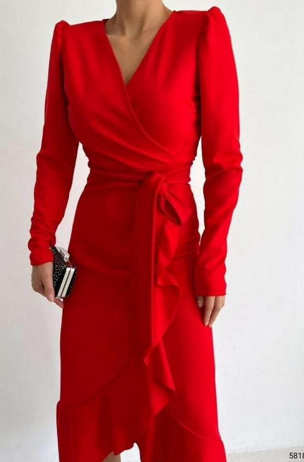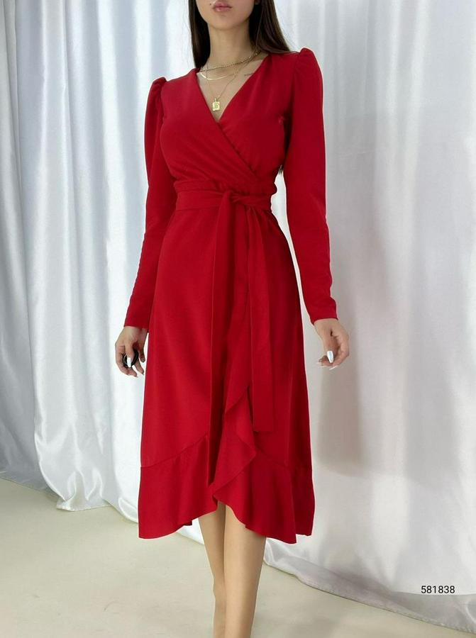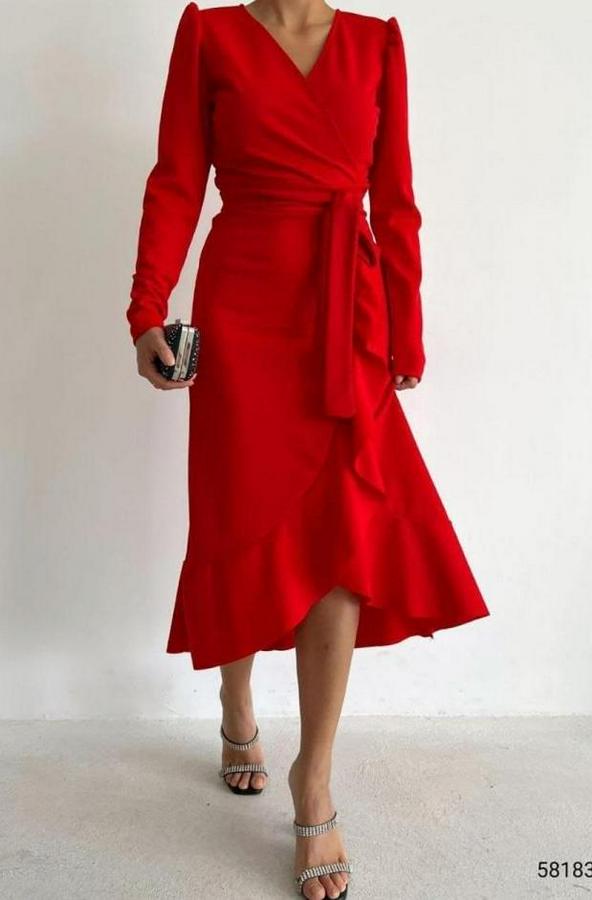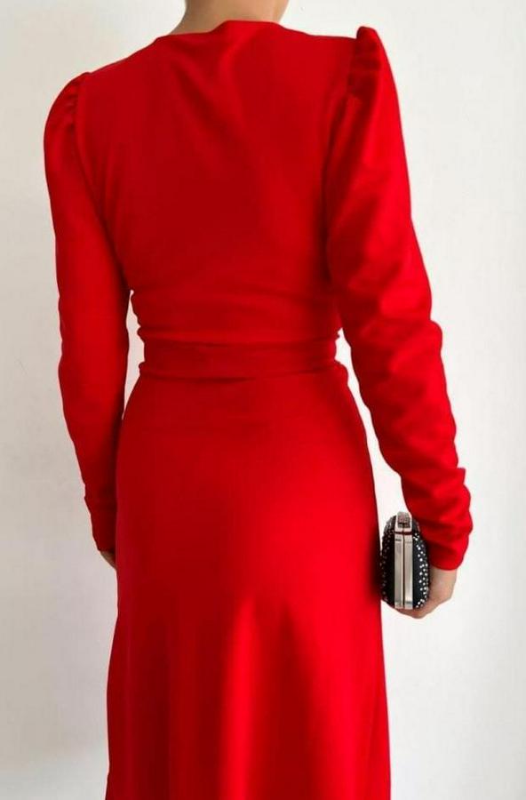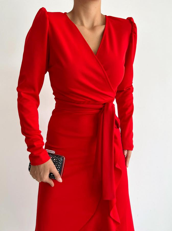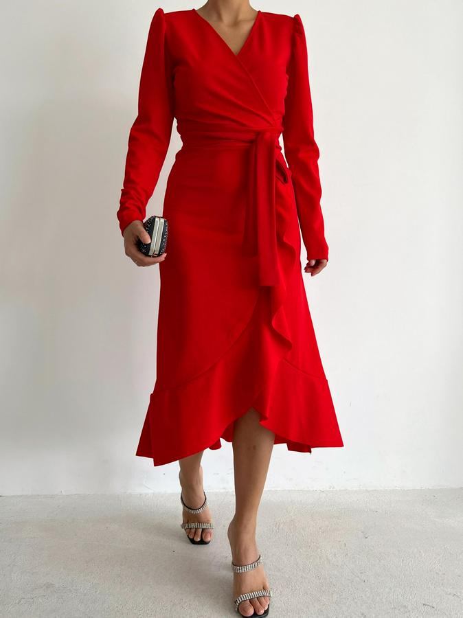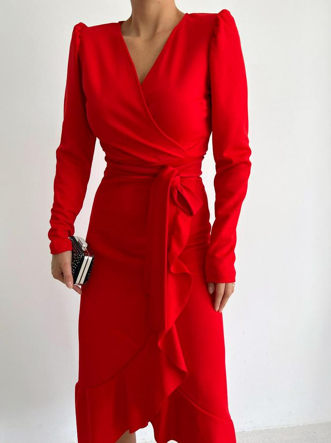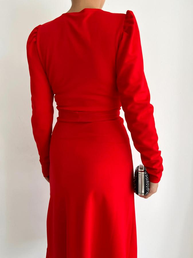 AnasayfaTüm ÜrünlerElbiseKrep Kumaş Midi Boy Kuşaklı Uzunkol Elbise