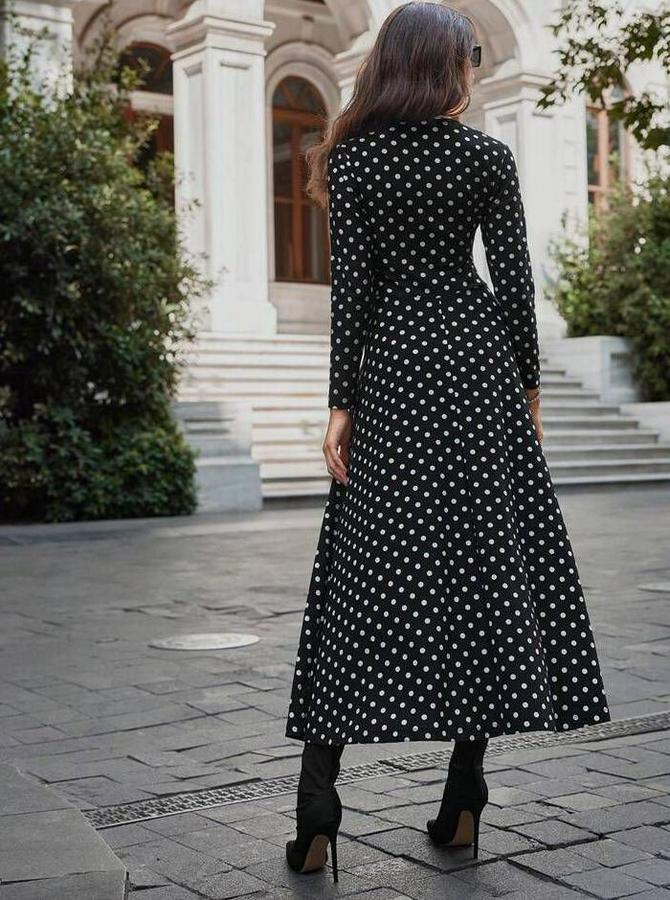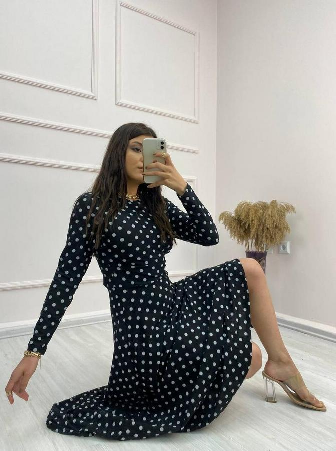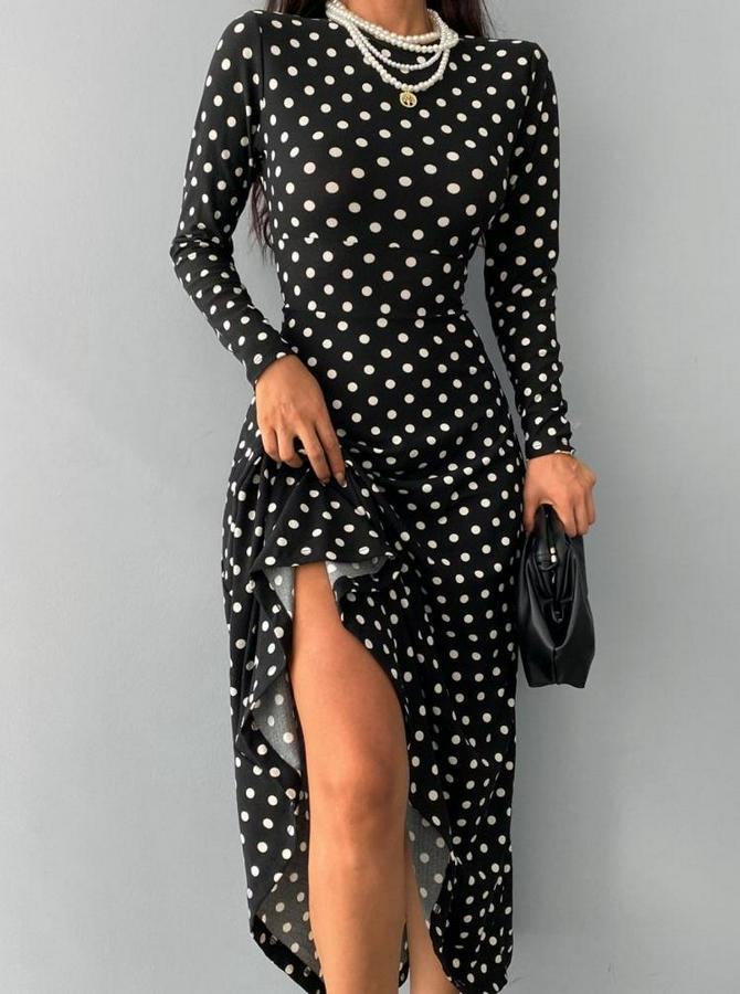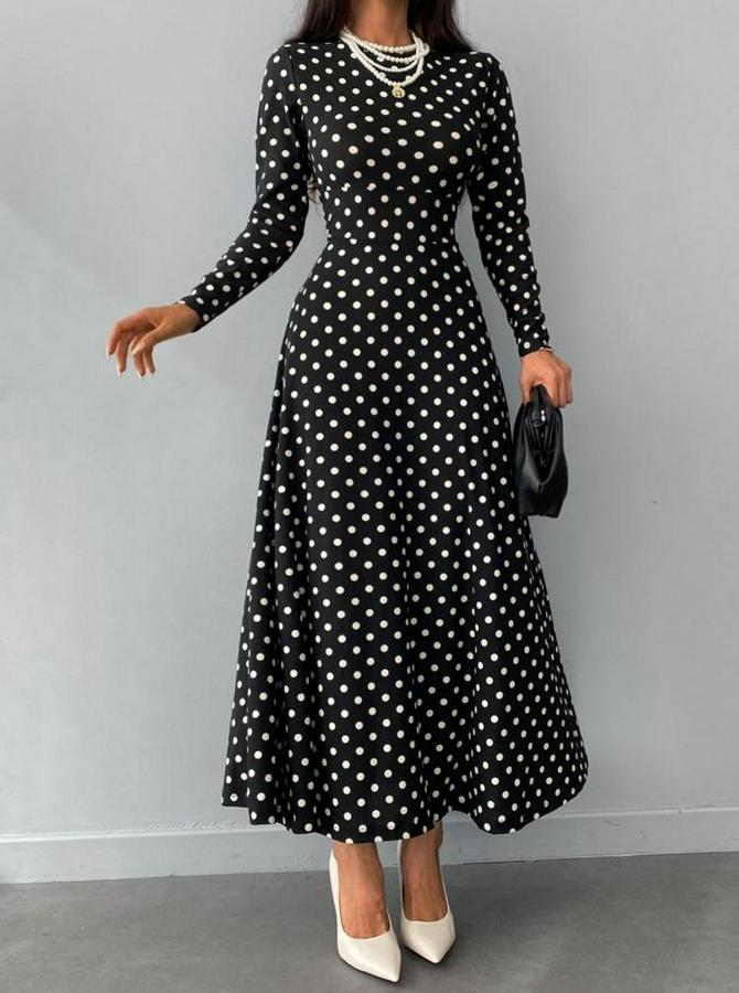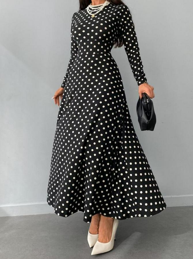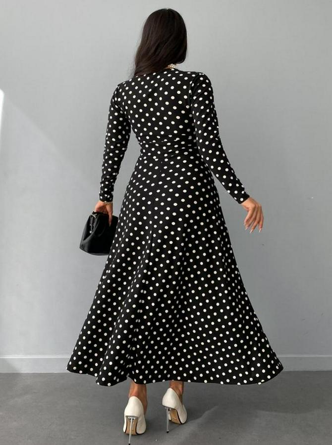 AnasayfaTüm ÜrünlerElbiseKrep Kumaş Uzun Kollu Tam Boy Puantiyeli Elbise 132 Cm