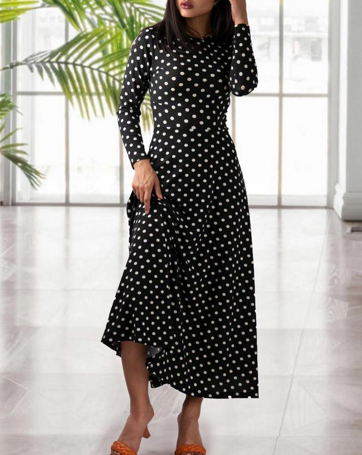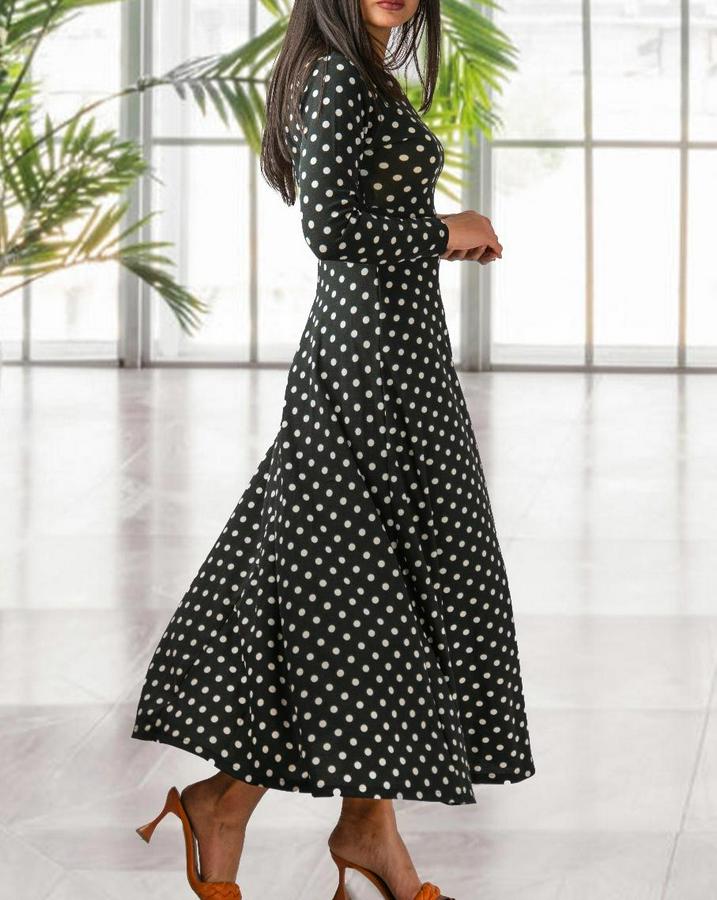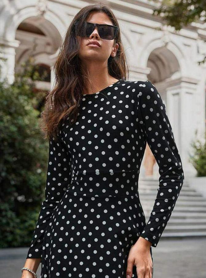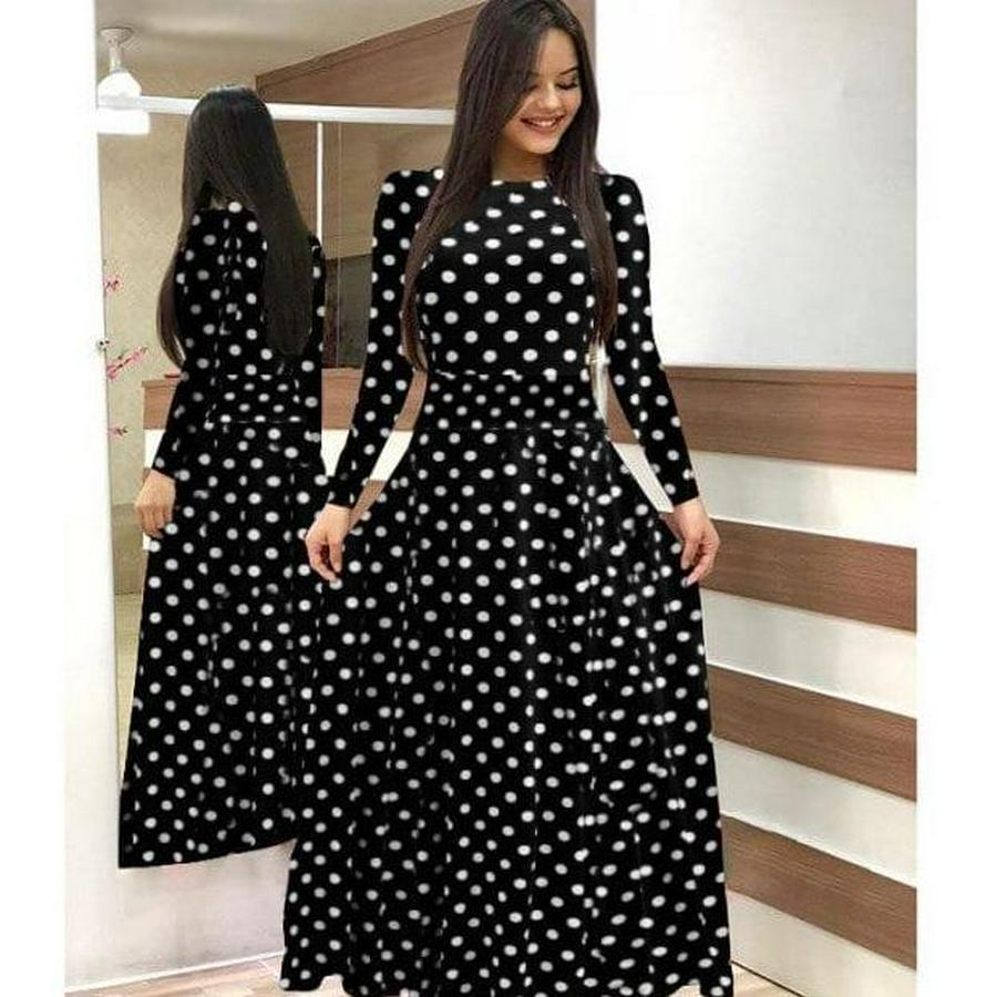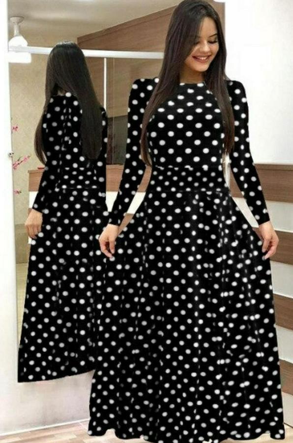 AnasayfaTüm ÜrünlerElbiseKrep Kumaş Uzun Kollu Tam Boy Puantiyeli Elbise 132 Cm