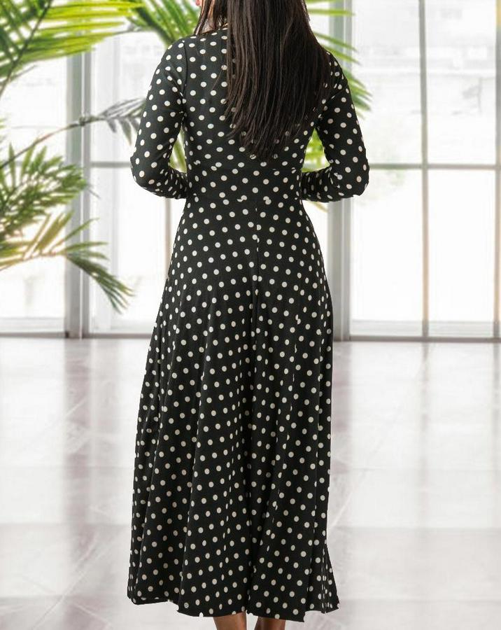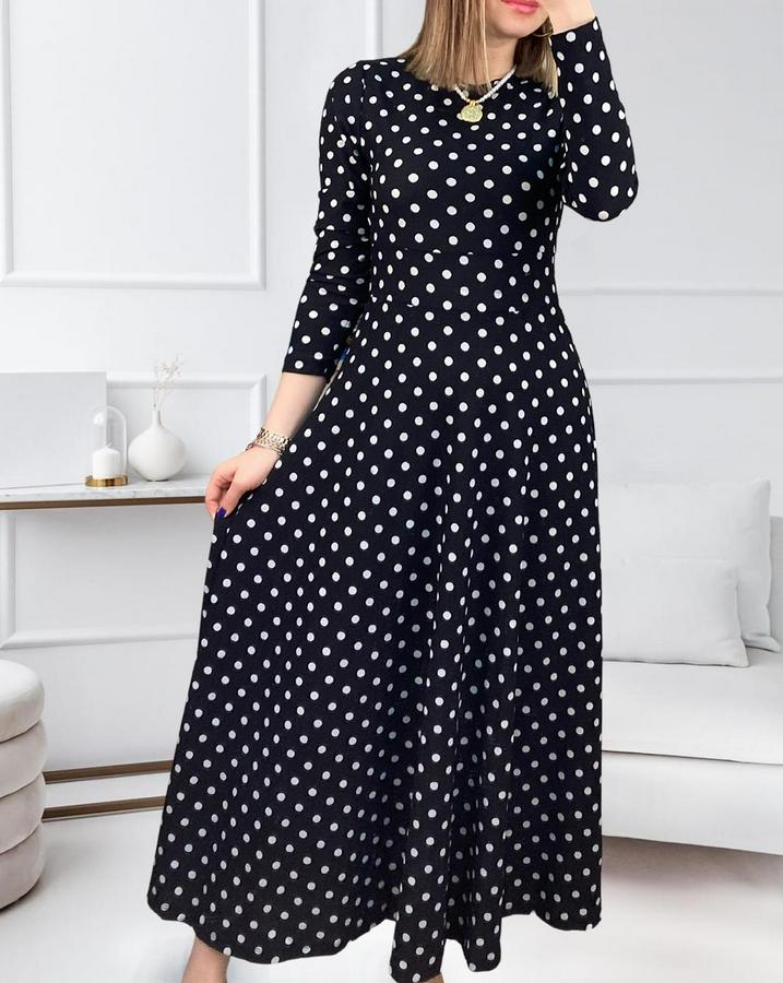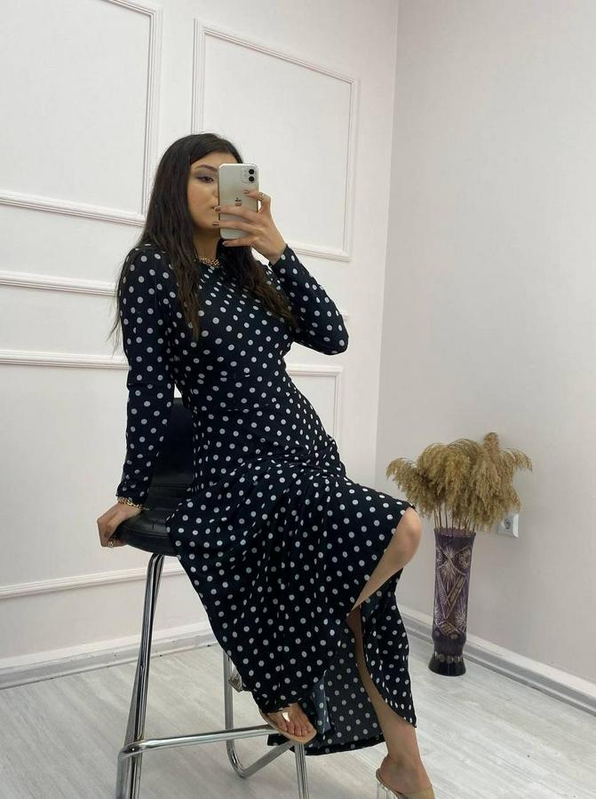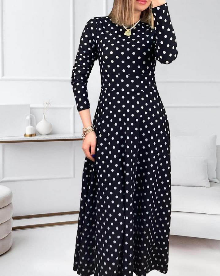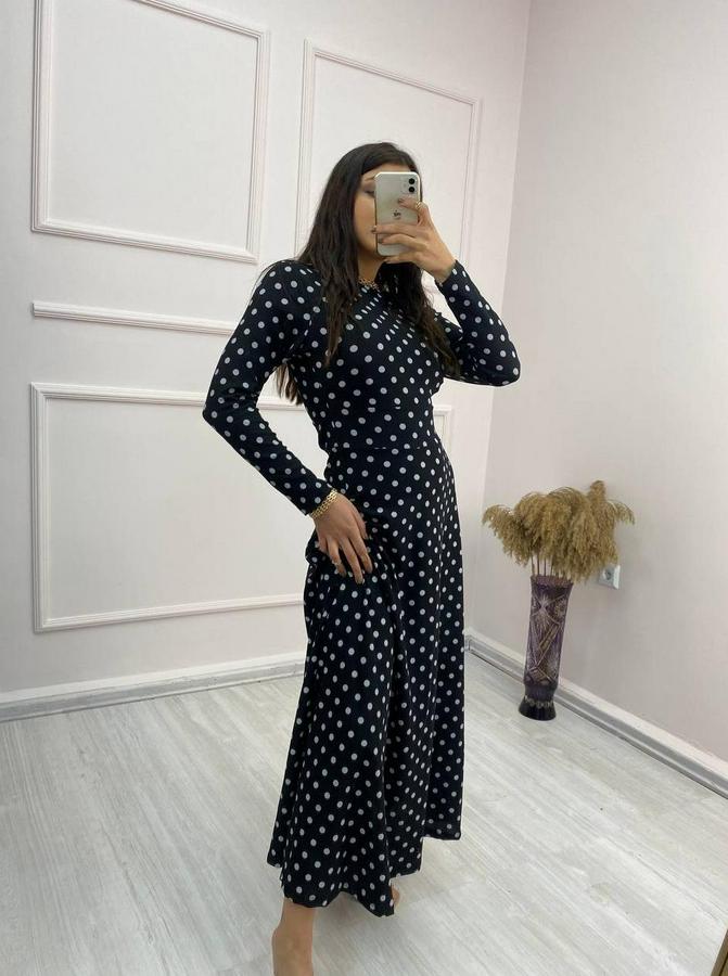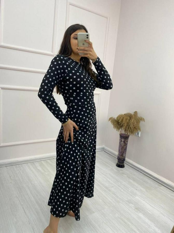Kadın Krep Kumaş Uzun Kollu Tam Boy Puantiyeli Elbise 132 Cm