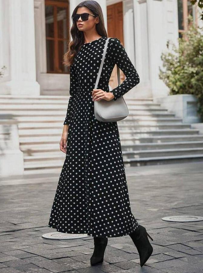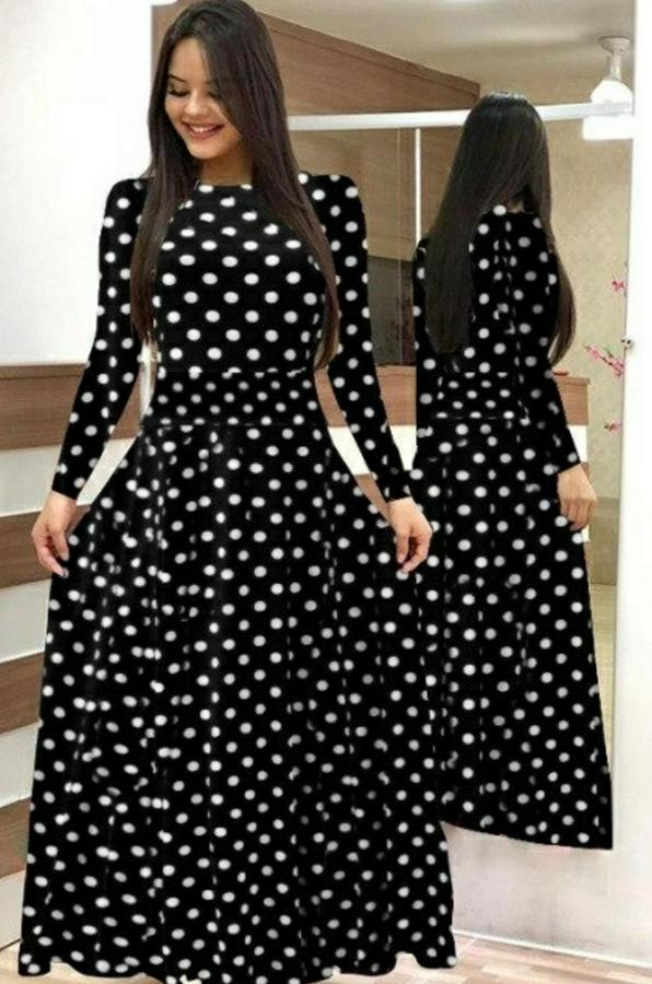 Krep Kumaş Uzun Kollu Tam Boy Puantiyeli Elbise 132 Cm
