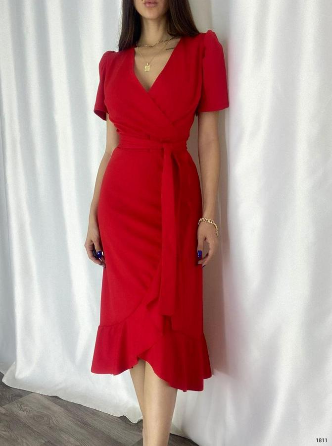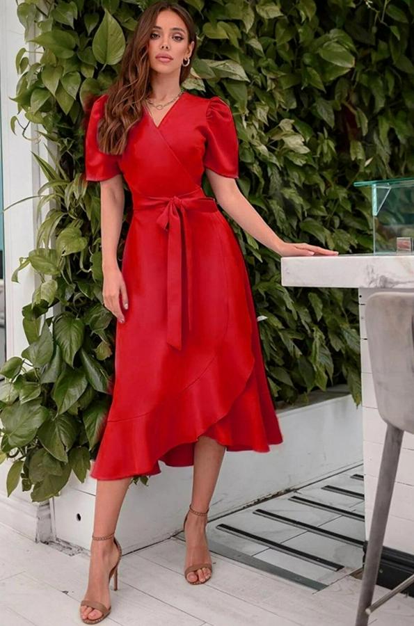 Kadın Kruvaze Yaka Midi Boy Kuşaklı Krep Elbise 120 Cm