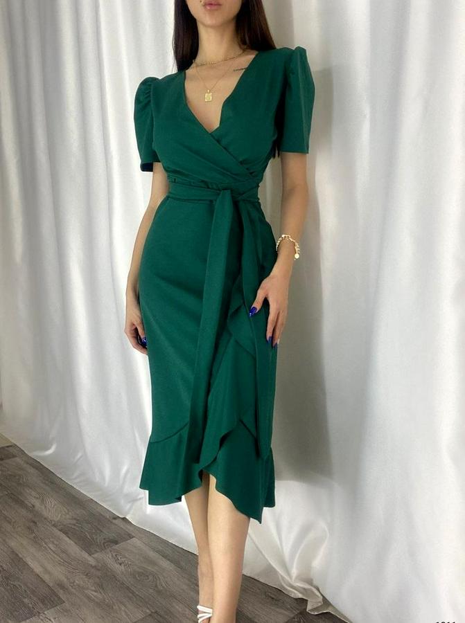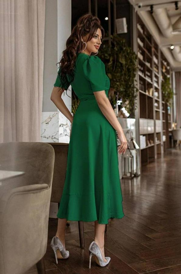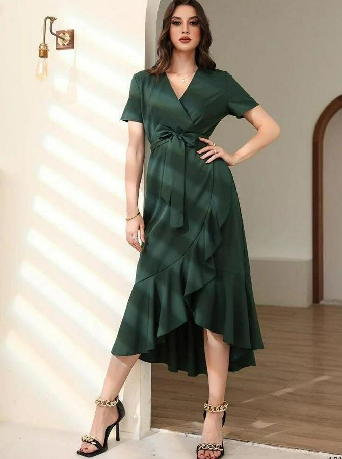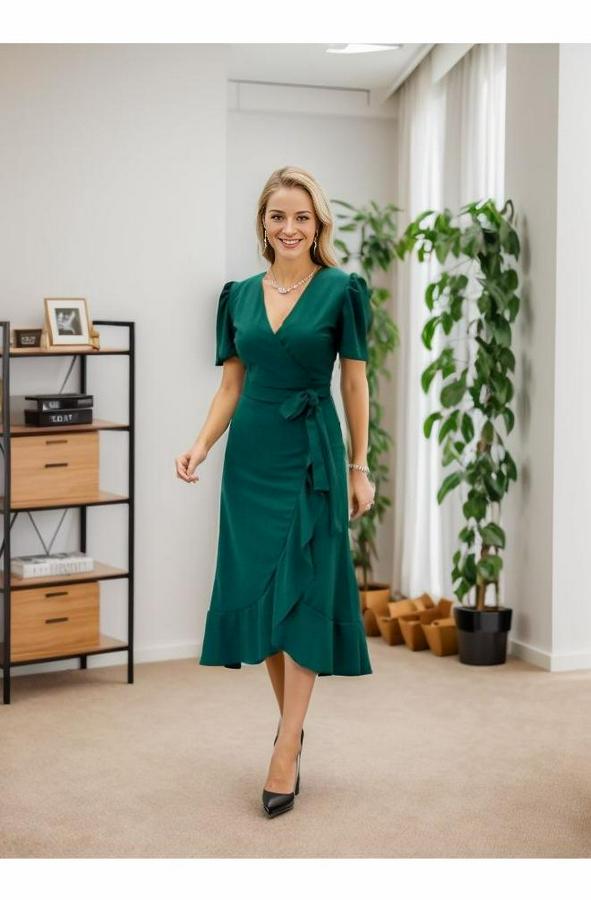 Kadın Kruvaze Yaka Midi Boy Kuşaklı Krep Elbise 120 Cm
