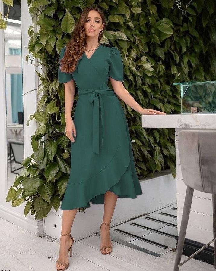 AnasayfaTüm ÜrünlerElbiseKruvaze Yaka Midi Boy Kuşaklı Krep Elbise 120 Cm