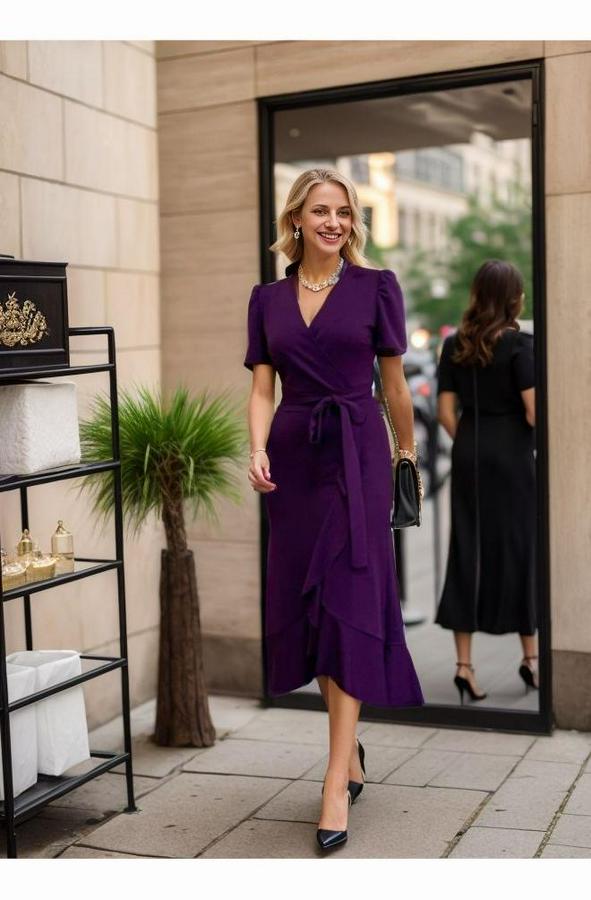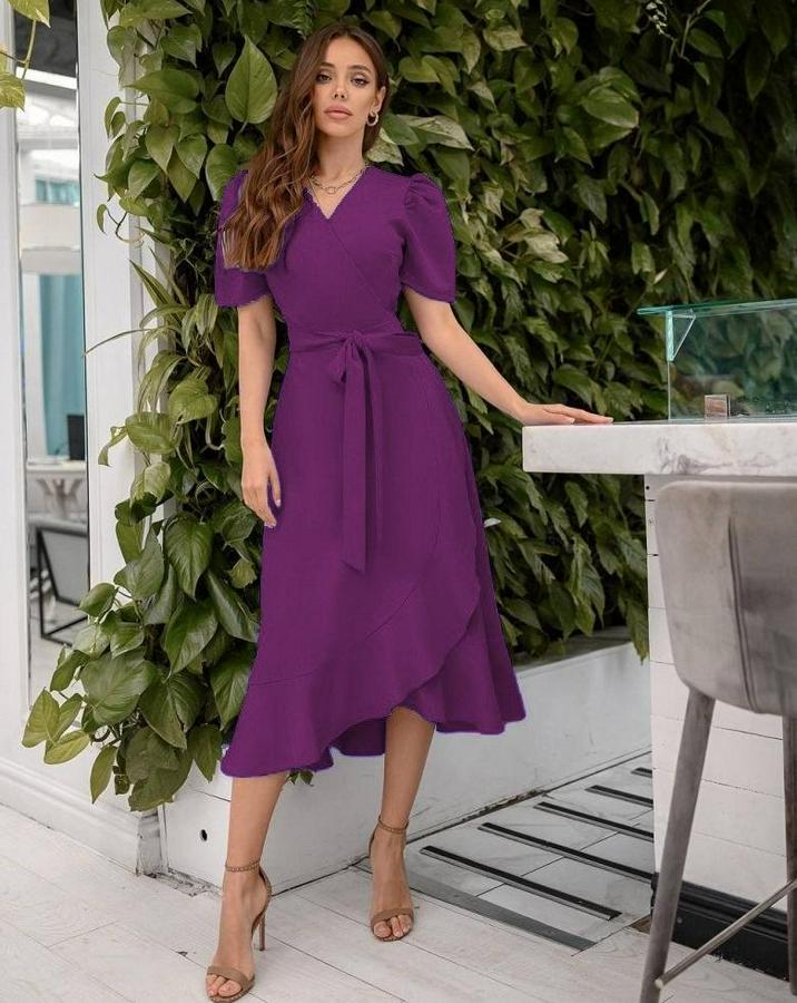 AnasayfaTüm ÜrünlerElbiseKruvaze Yaka Midi Boy Kuşaklı Krep Elbise 120 Cm