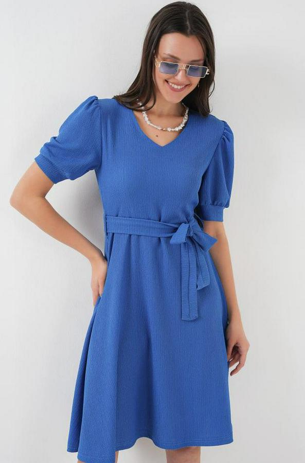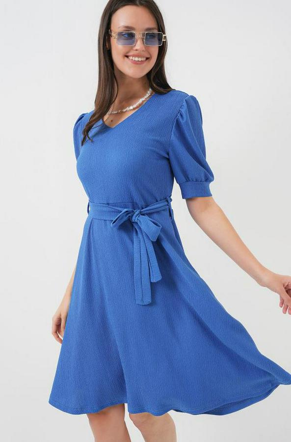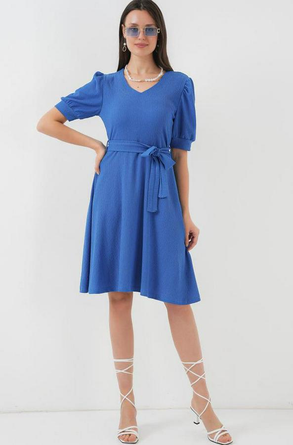 2370 Kuşaklı Örme Elbise - Saks