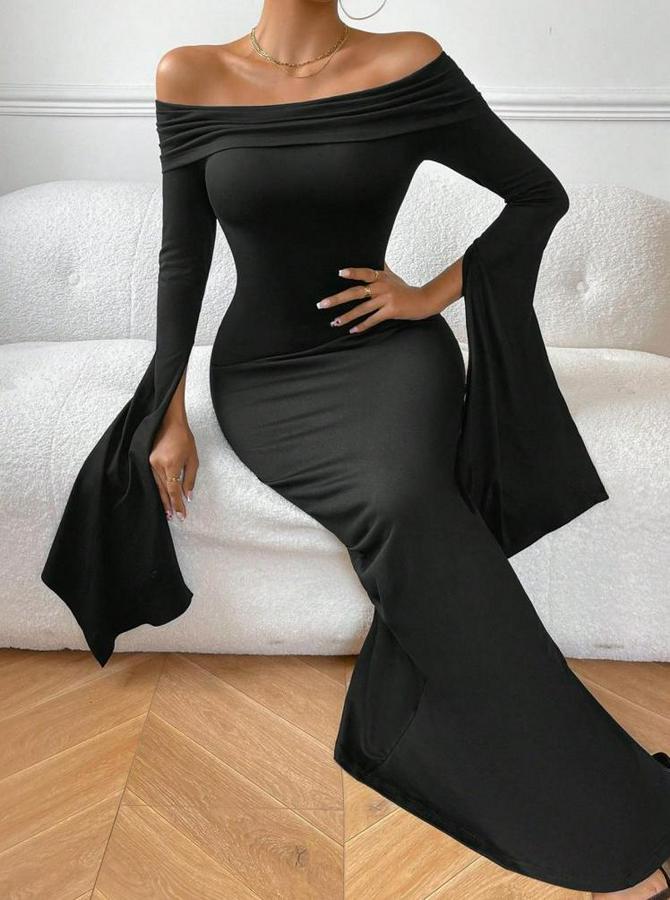 AnasayfaTüm ÜrünlerElbiseMadonna Yaka Uzun Yırtmaç Kol Detaylı Uzun Ithal Krep Elbise