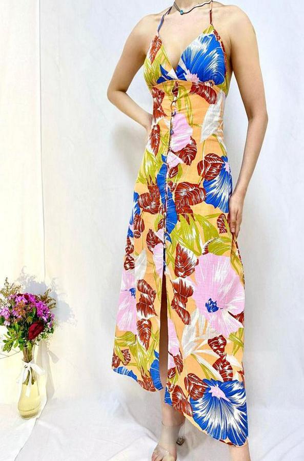 AnasayfaTüm ÜrünlerElbiseMavi Sırt Dekolteli Keten Elbise