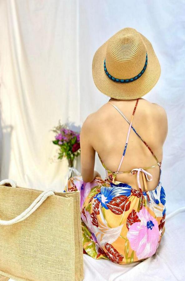 Mavi Sırt Dekolteli Keten Elbise