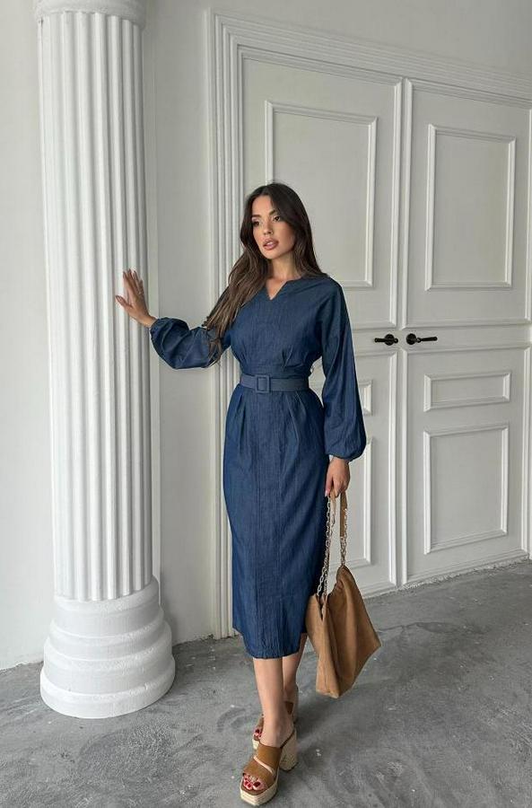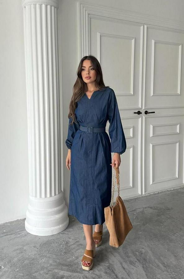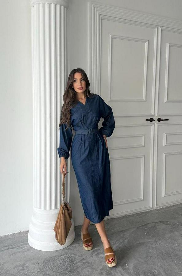 Mavi Tencel Uzun Kollu Elbise