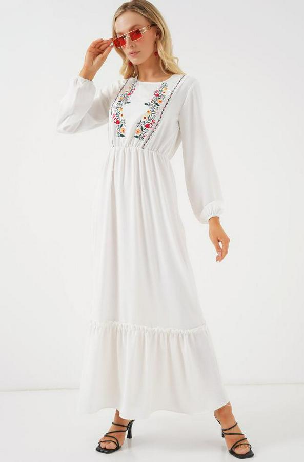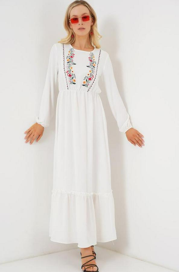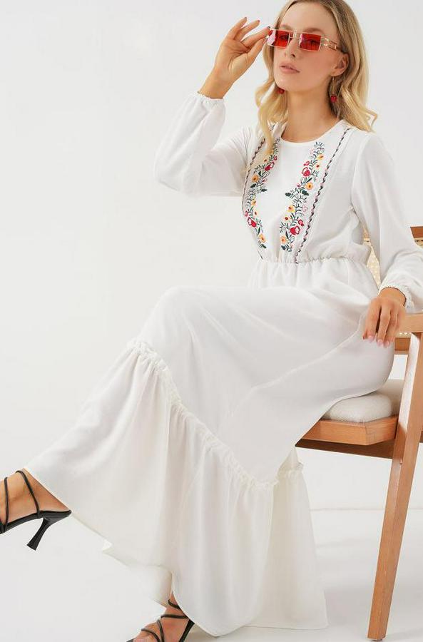 Nakışlı Uzun Tesettür Elbise 2550 - Beyaz