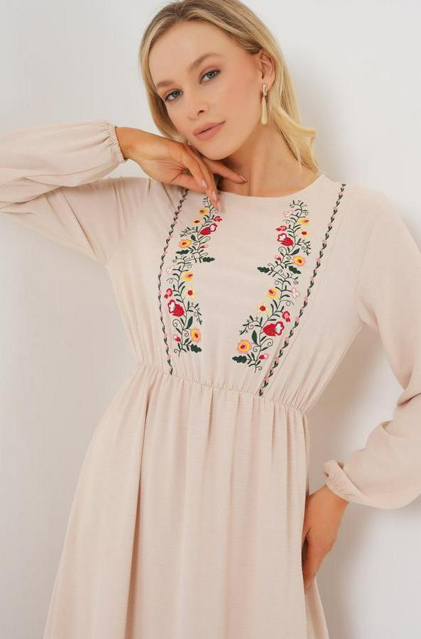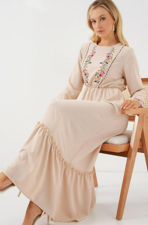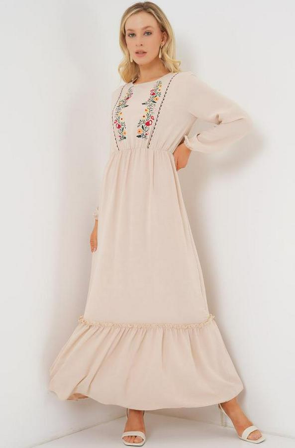 Nakışlı Uzun Tesettür Elbise 2550 - Krem