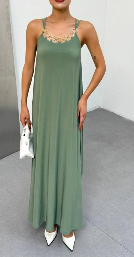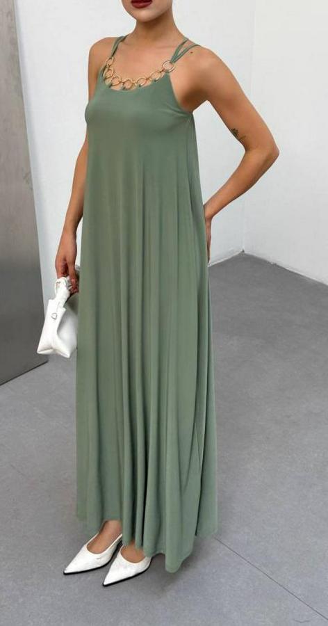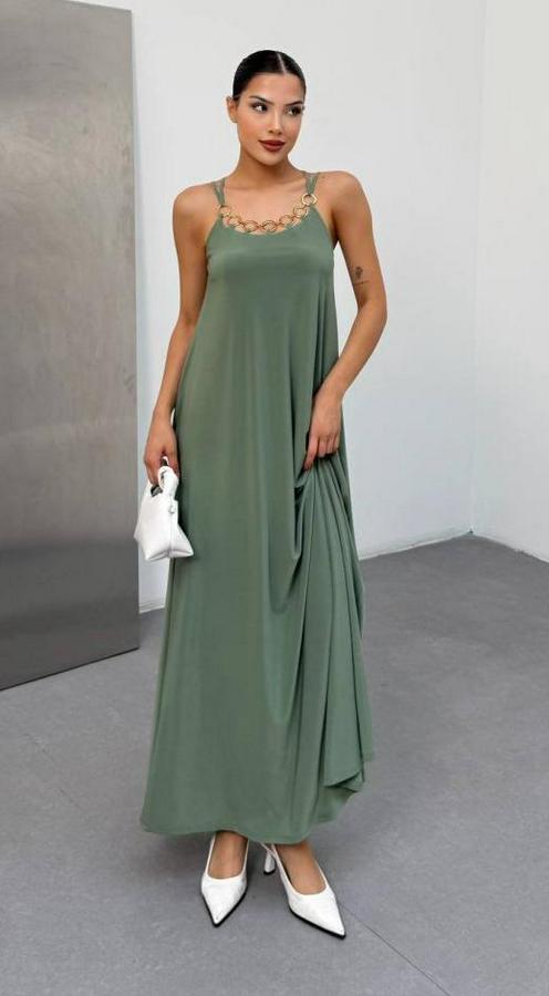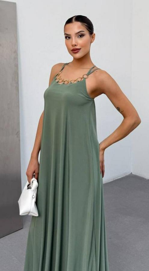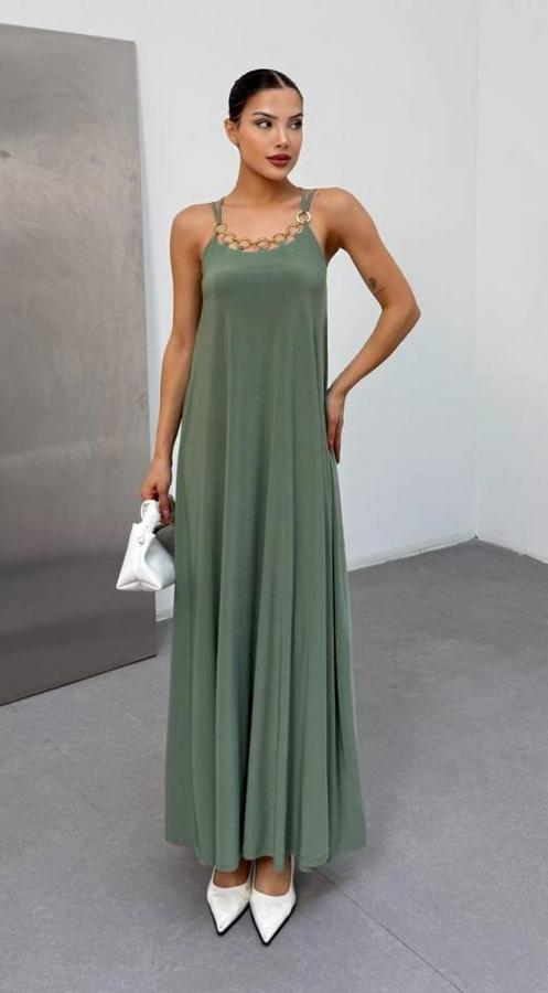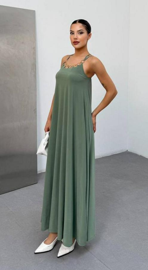 AnasayfaTüm ÜrünlerElbiseOmuz Askılı Kuş Gözü Zincir Detay Sandy Kumaş Maxi Boy Elbise