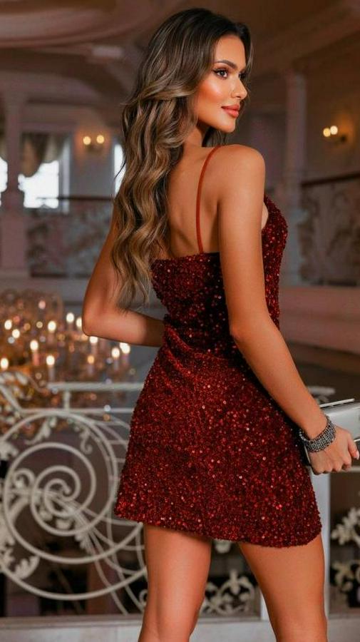 AnasayfaTüm ÜrünlerElbiseOmuz Askılı Sırt Dekolteli Kadife Kumaş Üzerine Full Pul Payetişlemeli Mini Elbise