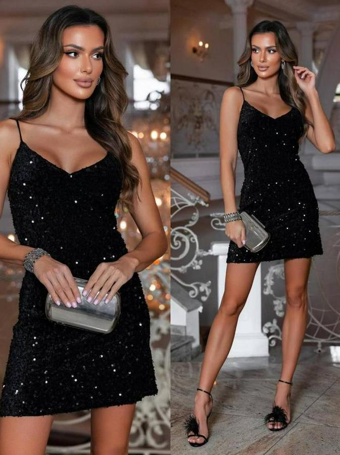 AnasayfaTüm ÜrünlerElbiseOmuz Askılı Sırt Dekolteli Kadife Kumaş Üzerine Full Pul Payetişlemeli Mini Elbise