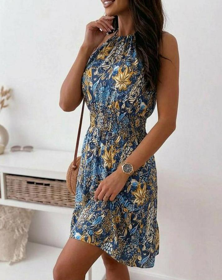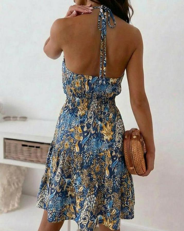 Omuzlardan Açık Beli Lastikli Desenli Kısa Süprem Elbise