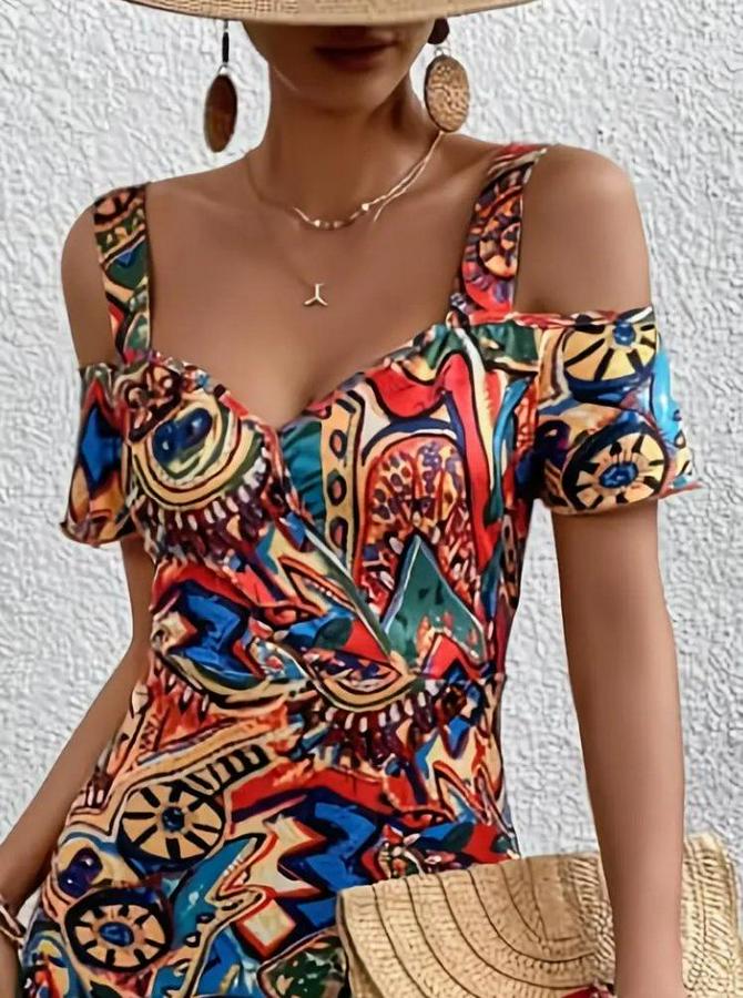 Omuzlardan Açıl Askılı Desenli Süprem Elbise