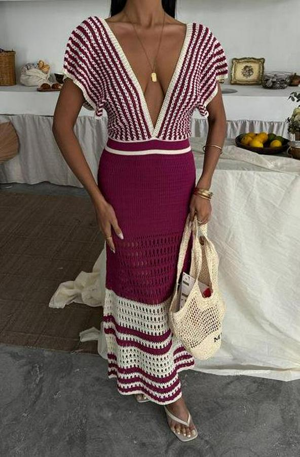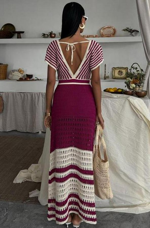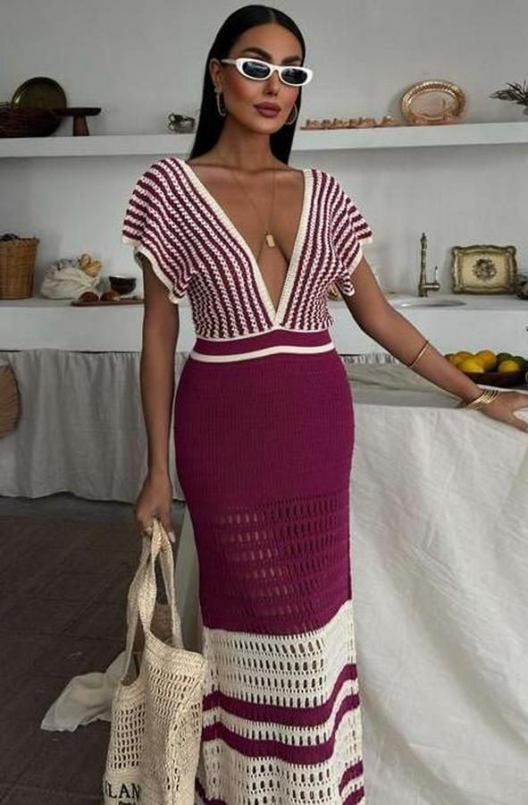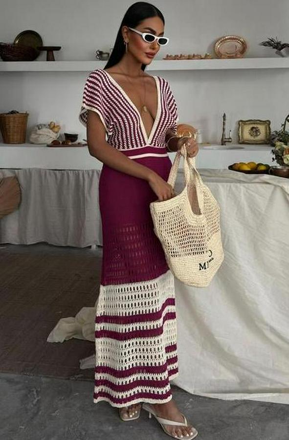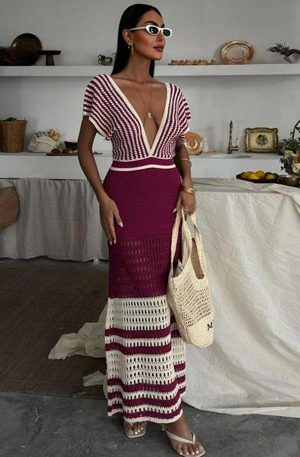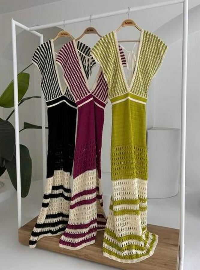 AnasayfaTüm ÜrünlerElbiseOmuzu Çizgili Ajurlu Triko Elbise 2868