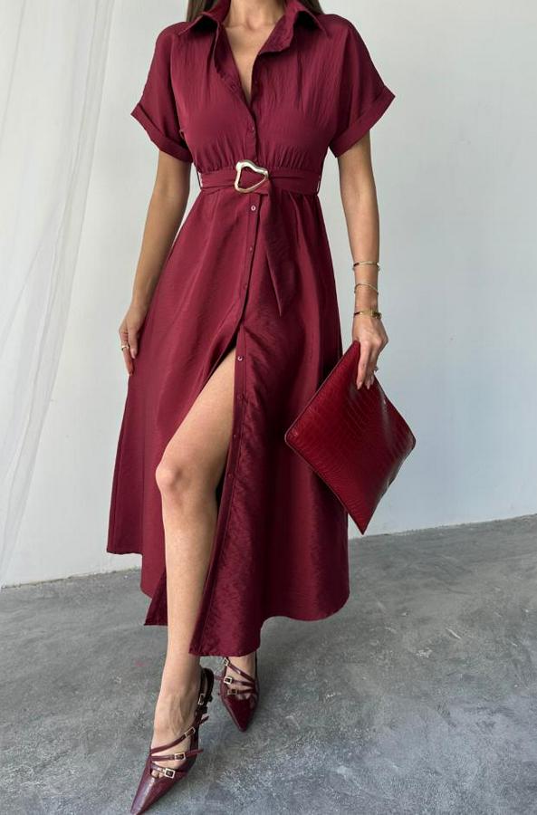 ÖNDEN DÜĞMELİ CRUSHLI MODAL ELBİSE - Bordo
