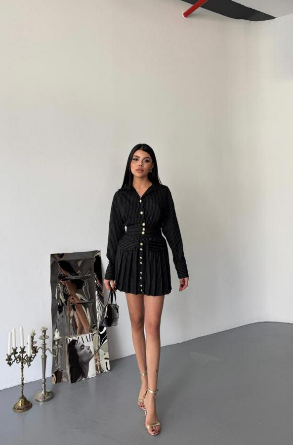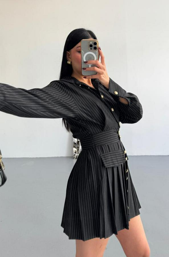 ÖNDEN GOLD DÜĞMELİ PİLELİ KISA ELBİSE - Siyah